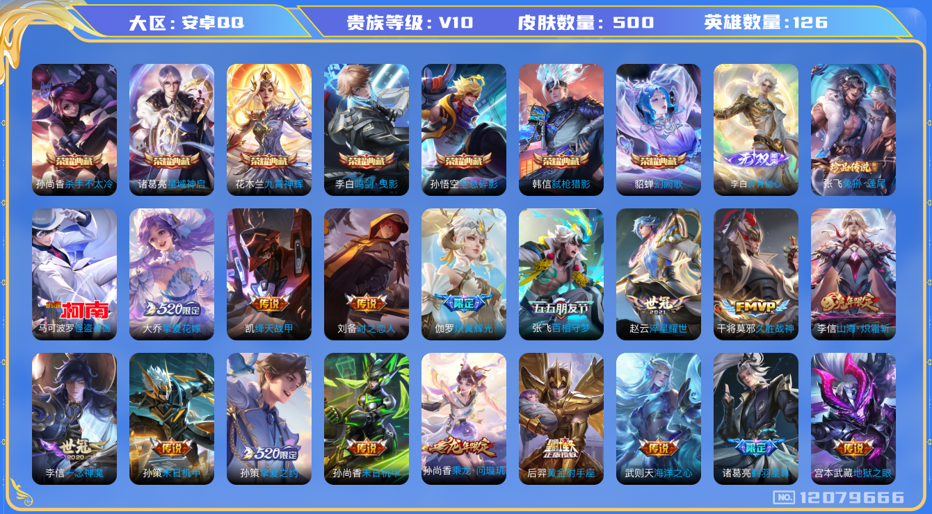 [12079666]V10 7典藏 1无双 2珍品传说 52传说 126英雄 500皮肤 典藏英雄武则天 可修改实名 优质装备:杀手不太冷,鸣剑·曳影,全息碎影(猴子典藏),星域神启(倪克斯贼亮),九霄神辉(木兰典藏),幻阙歌(貂蝉典藏),弑枪猎影(韩信典藏),碎月剑心(李白无双),Hello Kitty,怪盗基德,黄金射手座,冠军飞将,绛天战甲(鸡嘴战神),猫影幻舞,久胜战神,一念神魔,云霓雀翎,末日机甲-孙尚香(绿蚂蚱),地狱火,仲夏夜之梦(大飞蛾),零号·赤焰,海洋之心,地狱之眼,飞鸢探春,胖达荣荣,李逍遥,时之恋人-刘备(电焊工),游龙清影(小青龙),淬星耀世,超时空战士-狄仁杰,末日机甲-孙策,挚爱之约,挚爱花嫁,无双飞将,山海·炽霜斩(李信年限),炽翼辉光(娃娃菜牛角包),百相守梦(张飞),鹤羽星尊,艾琳觅芳踪,黄金天蝎座,涂山容容 珍品传说:兔狲·蓬尾 传说皮:乘龙·问璇玑(孙尚香年限),落雪白狼,幻光神枪 珍宝阁皮:妄想食味,优雅恋人,蔷薇恋人,女武神 限定皮:愿照·岁时盈(虞姬年限),鸣野蒿,夏侯惇霜北刀,至尊宝,白虎志(电光耗子),凤求凰(白切鸡),傲雪梅枪,补天,前尘镜,星穹之声,魔法小厨娘,飞衡(韩信年限),遇见飞天,高山流水,诗剑行,匿光决锋者,降魔,五谷丰年,冰锋战神,幽恒(沐浴露),武圣,游园惊梦,梁祝,逐梦之翼,逐梦之星,岱宗(典韦年限),天狼溯光者,祈雪灵祝(雪兔子),李小龙,玄武志(苏烈年限),朱雀志(守约年限),如梦令-嫦娥,圣诞老人,奇迹圣诞,真爱至上,纯白花嫁,猪悟能,大圣娶亲,天魔缭乱,青春决赛季,冰霜恋舞曲,热情桑巴,美猴王,匿光追影者,寅虎·瑞焰(虎皮蛋子),寅虎·赤拳(老虎年限),时之祈愿-瑶(瑶传限),百木心枪,启示之音,无尽星芒,深海之息(深海大菠萝),天降福星 史诗皮:鸭鸭历险记-刘禅,器灵·浮梦炉,狼魂孤将,化蝶舞,灵蛊蚀心,星界战将,谪仙醉月,龙之律动,雪豹·霜爪,藏狐·褐绒,石田雨龙,百相守梦-周瑜,戍鼓铭心,茶境仙,怒海争锋,炽弈燎原,东方月初,埋骨钱,芈月浮光幕影,海诺心动手记,琥珀纪元伽罗,决胜骁骑,上官婉儿群星魔术团,蔬乡物语(鲁班七号),百相守梦-百里守约,百相守梦-黄忠,紫霞仙子,苍穹之光,电玩小子(小书包),白龙吟,黄金分割率,特工魅影,千年之狐,永昼,末日机甲-莱西奥,雪夜绮愿(周瑜),魅语,百解令(蒙