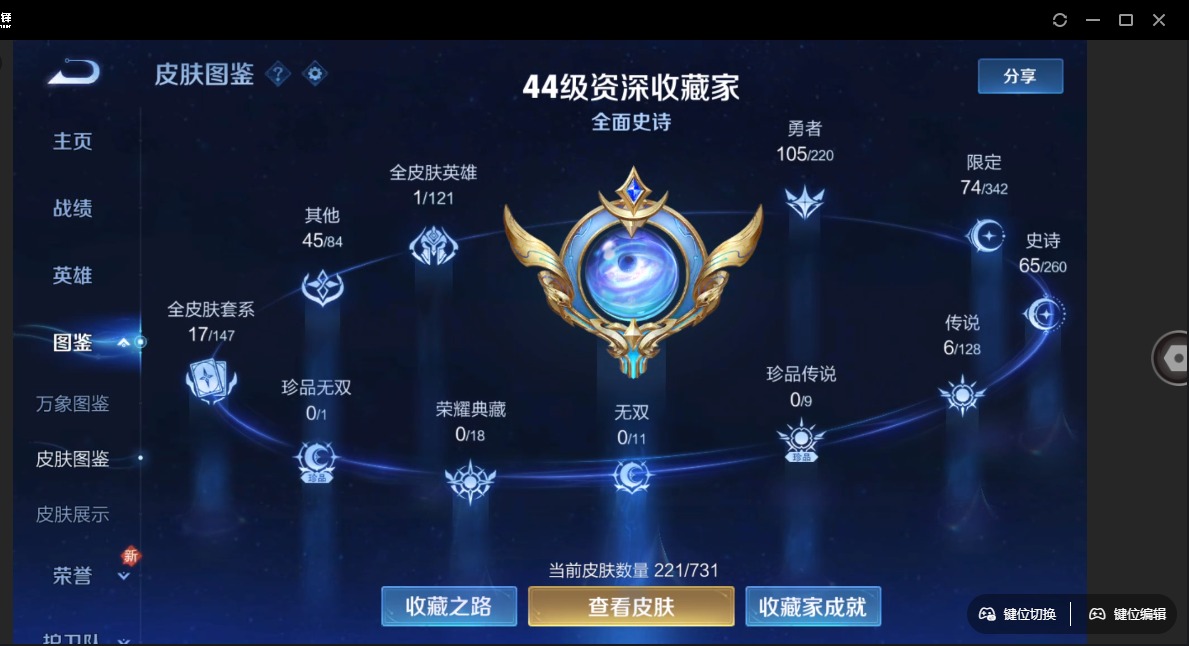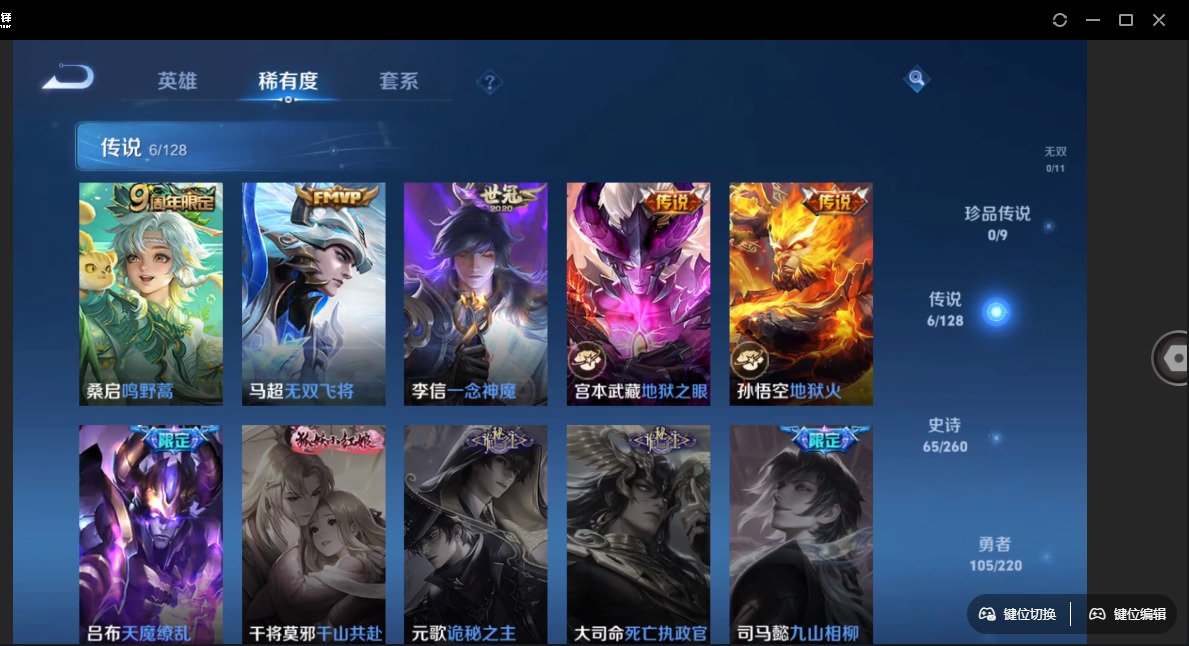 - [11527468]V4 1典藏 2传说 117英雄 103皮肤 可修改实名 优质装备:弑枪猎影(韩信典藏) 传说皮:幻光神枪 珍宝阁皮:玩趣恶龙 限定皮:愿照·岁时盈(虞姬年限),遇见飞天,五谷丰年 史诗皮:化蝶舞,紫霞仙子,特工魅影,江河有灵,猫狗日记-孙策,乱世虎臣,修罗,摇滚巨星,水果甜心,鬼剑武藏,心灵战警,乘风破浪,曙光守护者,金属风暴,原初追逐者,圣诞恋歌,鹰眼统帅,魅力维加斯