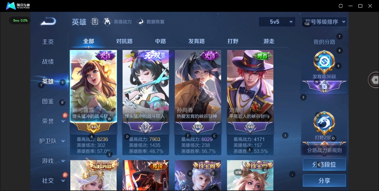 - PX_2017716-贵族等级: V5 英雄数: 110 皮肤数: 96 传说皮: 冠军飞将,云鹰飞将,妄想实况 限定皮: 李小龙,山海·玄木吟,鸣野蒿,逐霄战戟,愿照·九州拓