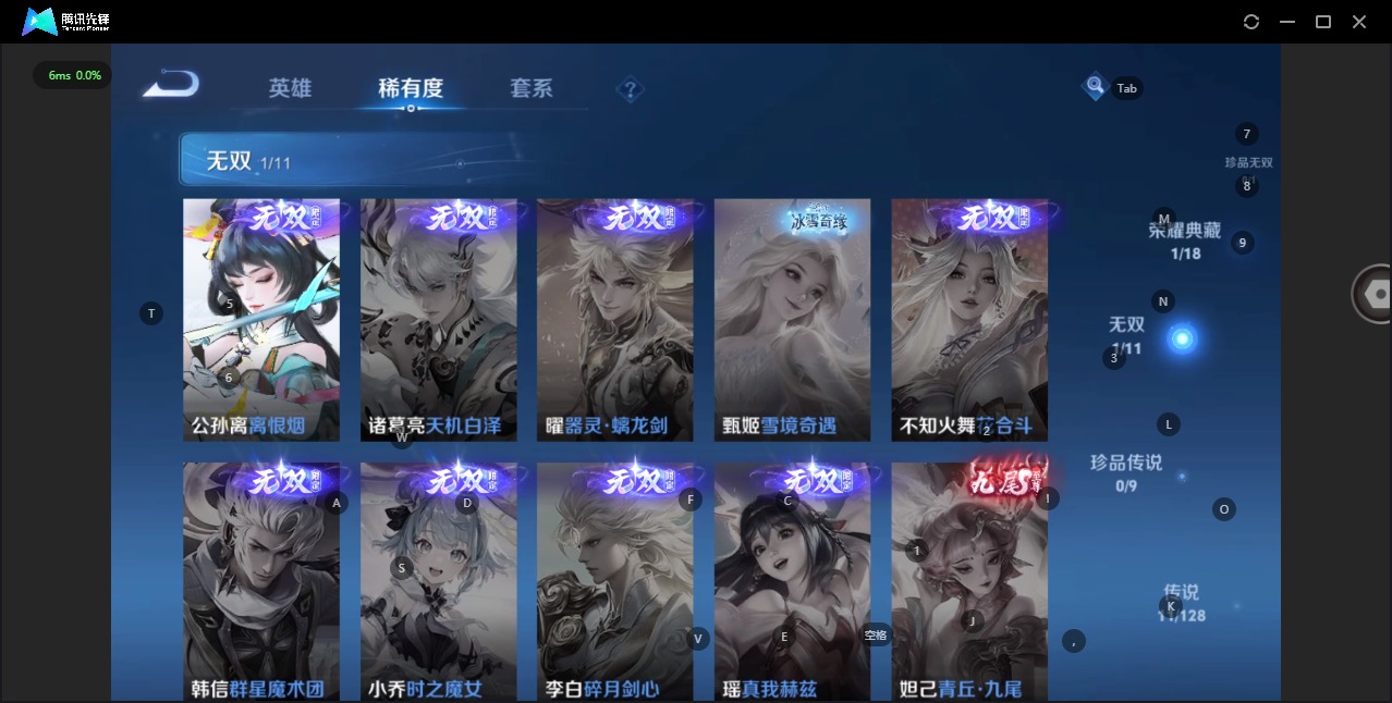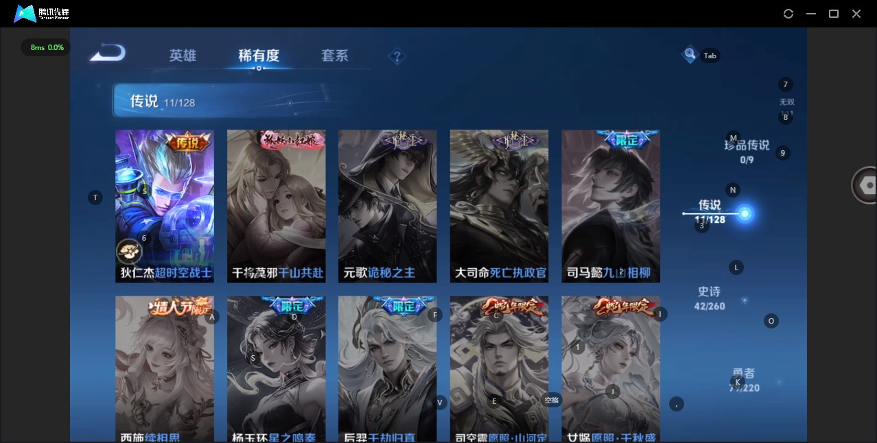 - [12134822]V6 4传说 97英雄 82皮肤 可修改实名 优质装备:黄金狮子座,云鹰飞将(小将军),零号·赤焰 珍宝阁皮:万物之道 限定皮:时雨天司(水龙头),梁祝,李小龙,朱雀志(守约年限),大圣娶亲,冰霜恋舞曲 史诗皮:苍穹之光,白龙吟,黄金分割率,千年之狐,修罗,水果甜心,心灵骇客,功夫厨神,幽灵船长,纤云弄巧,鹰眼统帅,魅力维加斯