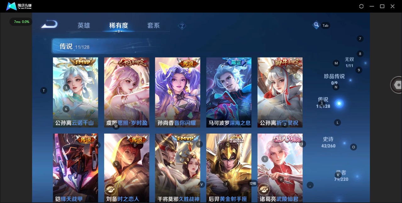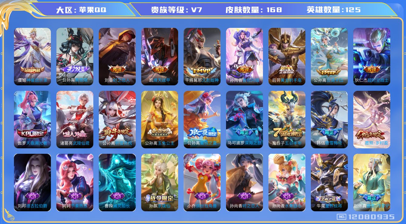 - [11579459]V7 11传说 120英雄 146皮肤 可修改实名 优质装备:一念神魔,澜逐花归海,千山共赴 传说皮:乘龙·问璇玑(孙尚香年限),乘龙·淬吴钩(孙策年限) 珍宝阁皮:胡桃夹子,蔷薇恋人 限定皮:愿照·九州拓(澜年限),愿照·岁时盈(虞姬年限),愿照·山河定(司空震年限),愿照·众生和(妲己年限),鸣野蒿,傲雪梅枪,怒海麟威,李小龙,大圣娶亲 史诗皮:化蝶舞,龙之律动,茶境仙,怒海争锋,破空之剑,超元猎域,百相守梦-百里守约,苍穹之光,白龙吟,特工魅影,偶像歌手,晚萤,末日机甲-吕布,乱世虎臣,节奏热浪,摇滚巨星,水果甜心,暗隐猎兽者,鬼剑武藏,心灵战警,纤云弄巧,乘风破浪,逐浪之夏,曙光守护者,箭羽风息,圣诞狂欢,圣诞恋歌,鹰眼统帅,魅力维加斯,赏金猎手,未来纪元-赵云
