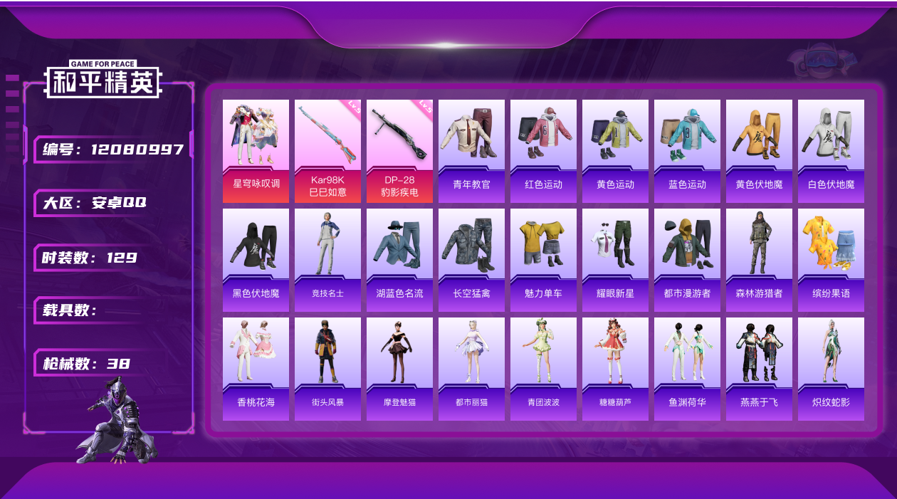 [12080997]1粉装 2特效枪 1印记 可二次 可修改实名 优质装备:星穹咏叹调,Kar98K-巳巳如意 稀有枪皮:DP-28-豹影疾电 五级特效枪:五级Kar98K-巳巳如意,五级DP-28-豹影疾电 紫色装扮:SS30特训套装,SS31特训套装,SS33特训套装,青年教官,魅力单车,黄色伏地魔,黄色运动,黑色伏地魔,香桃花海,都市漫游者,长空猛禽,湖蓝色名流,红色运动,缤纷果语,耀眼新星,蓝色运动,白色伏地魔,炽纹蛇影,鱼渊荷华,燕燕于飞,巳巳如意,森林游猎者,智谋强哥,青团波波,糖糖葫芦,竞技名士,都市丽猫,摩登魅猫,街头风暴,星影赞美诗,SS32特训服(SS32特训套装) 优质战备:千金淑猫降落伞,月影灵韵降落伞,临安公主降落伞,智耀战神降落伞