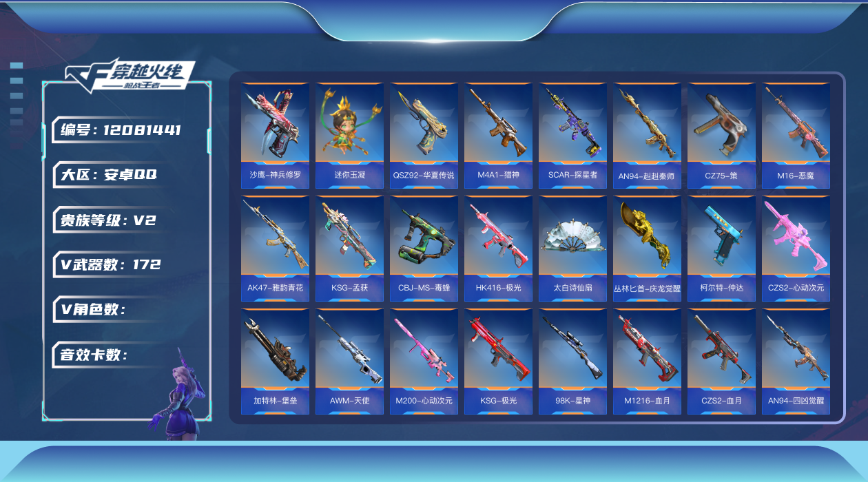 [12081441]可二次 可修改实名 V2 4王者武器 172英雄武器 262万化 大师 武器:王者之影,王者之心,王者之蝶,M4A1-仲达,MR1-龙吟惊沧海,CZ75-策,HK416-混世行者,AN94-卷帘大将军,KSG-孟获,王者之魂,AK47-黑武士觉醒,AK47-无影,AK47-火麒麟,M4A1-堕天神,M4A1-机械迷城,AK47-木兰,AK47-死神,M4A1-雷神,98K-黑骑士,QBZ03-死神,QBZ03-金色蔷薇,AWM-天使,双持斯泰尔-天使,MK5-极光,AK47-猩红传说,AK47-血武士,M4A1-心动次元觉醒,M4A1-破空冰刃,M4A1-猎神,M4A1-赛博雷神,M4A1-海骑士,AK47-黑鲨,98K-星神,09式狙-天神,M200-心动次元,AK12-天启,剑齿虎-炫彩,SCAR-幽暗骑士觉醒,SCAR-探星者,AN94-四凶觉醒,AWM-天龙,AWM-裁决,CBJ-MS-毒蜂,汤姆逊-烈龙,CZS2-心动次元,CZS2-血月,寒霜烈龙,MG3-雏凤,加特林-蟒蛇,加特林-堡垒,AK47-破空冰刃,AA12-火药,地狱烈炎,M1216-血月,KSG-极光,AK47-雅韵青花,柯尔特-仲达,HK416-极光,AN94-赳赳秦师,QSZ92-华夏传说,M16-恶魔,沙鹰-无影,沙鹰-宇航兔兔,沙鹰-神兵修罗,手斧-机械迷城,龙啸-堕天神,战斧-无影,蝴蝶刀-极光,蚩尤战弓觉醒,马来剑-毁灭,斩魔剑-天使,擎天觉醒,MK47-塔罗牌觉醒,神罚战斧,丛林匕首-庆龙觉醒,麒麟刺,星芒,龙鳞-觉醒,唐刀-华夏传说,斩魔刀,迷你玉凝,太白诗仙扇,烟雾弹-游骑兵,闪光弹-游骑兵,高爆手雷-无限,分裂雷-偃蛇,气勇胆烈戟,掠夺者P365-虹舞,GLOCK18-猎神,HK417-朱雀,双持沙鹰-元让,SCAR-心动PICK,马来剑-耀金伯爵,鹰爪-迷城红光觉醒,QBZ97-浩瀚征途,AWM-指南针觉醒,破邪蛇棍觉醒,甩棍-卧龙觉醒,烟雾弹-星际宇航,G3A3-衍神兵,末日裁决觉醒,猎弩-虫族女王,M1887-幽冥玄喵觉醒,MAC-10-孟获,QSZ92-冰魂觉醒,烈焰刀,烈焰弓,手雷-游骑兵,QBZ03-天罚,黑骑士燃烧弹