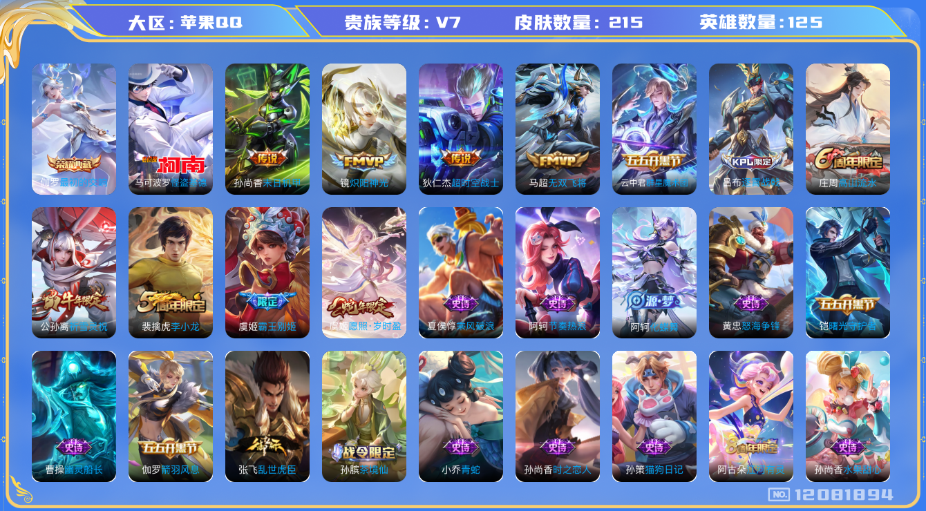 [12081894]V7 1典藏 1珍品传说 7传说 125英雄 215皮肤 可修改实名 优质装备:最初的交响(伽罗典藏),怪盗基德,炽阳神光,末日机甲-孙尚香(绿蚂蚱),超时空战士-狄仁杰,无双飞将,云中君群星魔术团 珍宝阁皮:蔷薇恋人 限定皮:愿照·岁时盈(虞姬年限),逐霄战戟,高山流水,祈雪灵祝(雪兔子),李小龙,霸王别姬-虞姬 史诗皮:鸭鸭历险记-刘禅,器灵·浮梦炉,化蝶舞,星界战将,龙之律动,茶境仙,怒海争锋,埋骨钱,芈月浮光幕影,上官婉儿群星魔术团,蔬乡物语(鲁班七号),百相守梦-百里守约,紫霞仙子,黄金分割率,千年之狐,江河有灵,末日机甲-莱西奥,青蛇,偶像歌手,电玩·爆裂旋风,末日机甲-吕布,猫狗日记-孙策,时之恋人-孙尚香,乱世虎臣,节奏热浪,修罗,女仆咖啡,水果甜心,绅士熊喵,星夜王子,暗隐猎兽者,幽灵船长,鬼剑武藏,天秀·启明,纤云弄巧,乘风破浪,逐浪之夏,水晶猎龙者,曙光守护者,箭羽风息,原初追逐者,圣诞狂欢,鹰眼统帅,暗夜贵公子,魅力维加斯,奇遇舞章,无心