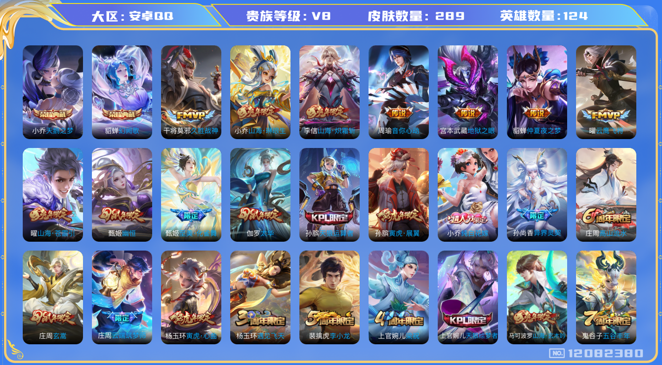 [12082380]V8 2典藏 14传说 124英雄 289皮肤 可修改实名 优质装备:天鹅之梦(小乔典藏),幻阙歌(貂蝉典藏),云鹰飞将(小将军),久胜战神,仲夏夜之梦(大飞蛾),地狱之眼,音你心动-周瑜,山海·炽霜斩(李信年限),山海·琳琅生(小乔年限),山海·苍雷引(电光曜子) 珍宝阁皮:蔷薇恋人,女武神 限定皮:太华(伽罗年限),异界灵契(白毛香),寅虎·展翼(孙膑年限),时之彼端,白晶晶,神威(电光马子),飞衡(韩信年限),玄嵩(庄周年限),山海·碧波行(瑶年限),至美·化雀舞,遇见飞天,高山流水,齐天大圣,五谷丰年,冰锋战神,幽恒(沐浴露),天狼运算者,梁祝,天狼绘梦者,李小龙,霸王别姬-虞姬,奇迹圣诞,纯白花嫁,云端筑梦师,寅虎·心曲(虎婆),时之祈愿-瑶(瑶传限),山海·玄木吟(马可年限),冰霜神祇 史诗皮:化蝶舞,龙之律动,遇见神鹿,苍穹之光,电玩小子(小书包),特工魅影,千年之狐,江河有灵,魅语,蒙恬荣光圣徽,冰冠公主,青蛇,偶像歌手,晚萤,龙骑士(小龙虾),末日机甲-吕布,猫狗日记-孙策,时之恋人-孙尚香,乱世虎臣,节奏热浪,修罗,女仆咖啡,摇滚巨星,水果甜心,绅士熊喵,天才门将,星夜王子,心灵骇客,时之奇旅-安琪拉,功夫厨神,德古拉伯爵,暗隐猎兽者,幽灵船长,鬼剑武藏,心灵战警,舞动绿茵,地狱岩魂,纤云弄巧,繁星吟游(呼啦呼啦),拒霜思,缤纷独角兽,乘风破浪,逐浪之夏,水晶猎龙者,热力回旋,金属风暴,原初追逐者,圣诞狂欢,圣诞恋歌,鹰眼统帅,魅力维加斯,黎明之约,未来纪元-赵云