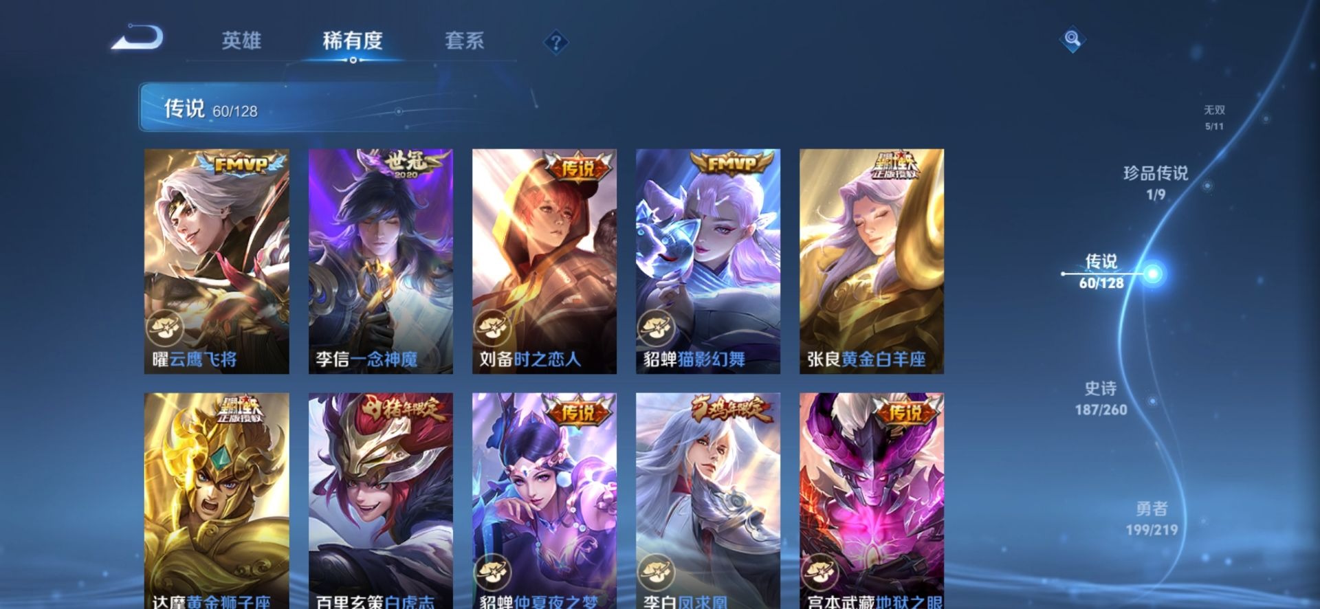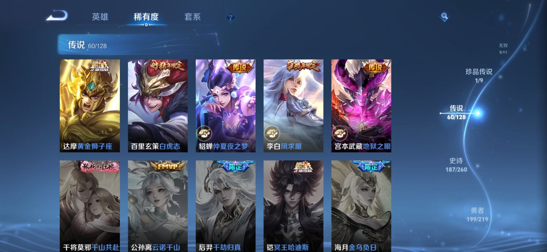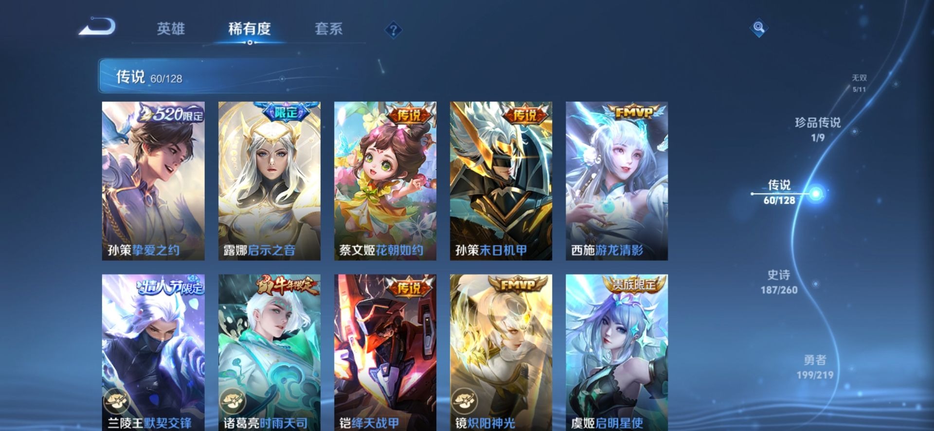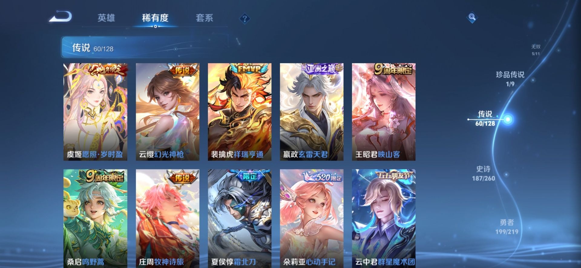 - [12808090]安卓Q-V0-至尊星耀III段位-124英雄-221皮肤-0典藏-0珍品无双-0无双-0珍品传说-4传说-61史诗 【传说皮肤】:司空震愿照山河定,桑启鸣野蒿,马超无双飞将,镜炽阳神光 【限定皮肤】:白起狰,蔡文姬夏日便利店,虞姬夏日便利店,姜子牙天穹之誓,狄仁杰阴阳师,赵云皇家上将,庄周高山流水,高渐离玩趣恶龙,阿轲迷踪丽影,芈月重明,元歌云间偶戏,元歌无心,夏侯惇朔风刀,曹操烛龙,典韦穷奇,马可波罗暗影游猎,狄仁杰魔术师,狄仁杰万华元夜,达摩星际陆战队,达摩沙漠行僧,项羽海滩派对,老夫子醍醐杖,程咬金演武夺筹,刘邦夺宝奇兵,兰陵王金庭之子,亚瑟潮玩骑士王,孙悟空至尊宝,牛魔御旌,李元芳云中旅人,钟馗驱傩正仪,雅典娜单词大作战,雅典娜黎明之约,蔡文姬繁星吟游,太乙真人饕餮,太乙真人华丽摇滚,鬼谷子原初探秘者,鬼谷子五谷丰年,苏烈千军破阵,百里玄策原初追逐者,弈星混沌棋,梦奇顽趣,沈梦溪大漠名商,明世隐疑决卦,裴擒虎李小龙,裴擒虎擒涛扼浪,狂铁御狮,米莱狄御霄,米莱狄胡桃异想国,云中君纤云弄巧,盾山御銮,猪八戒西部大镖客,上官婉儿梁祝,蒙犽狂想玩偶喵,鲁班大师探海日志,桑启海盐诗旅,艾琳流音漫舞,司空震地狱燃心,张良古海寻踪,蒙犽百解令,蒙恬荣光圣徽,鬼谷子天穹祈灯,姬小满妄想食味,沈梦溪龙舞盛年,刘邦剑破天穹,周瑜熔金海岸 【赛季限定】:白起狰,芈月重明,夏侯惇朔风刀,曹操烛龙,典韦穷奇,狄仁杰万华元夜,达摩沙漠行僧,老夫子醍醐杖,程咬金演武夺筹,兰陵王金庭之子,张良古海寻踪,牛魔御旌,李元芳云中旅人,钟馗驱傩正仪,雅典娜黎明之约,太乙真人饕餮,鬼谷子原初探秘者,苏烈千军破阵,百里玄策原初追逐者,弈星混沌棋,梦奇顽趣,沈梦溪大漠名商,明世隐疑决卦,裴擒虎擒涛扼浪,狂铁御狮,米莱狄御霄,盾山御銮,鲁班大师探海日志,桑启海盐诗旅,鬼谷子天穹祈灯,蒙恬荣光圣徽,刘邦剑破天穹,姜子牙天穹之誓 【战令限定】:蔡文姬夏日便利店,虞姬夏日便利店,阿轲迷踪丽影,元歌云间偶戏,马可波罗暗影游猎,达摩星际陆战队,刘邦夺宝奇兵,艾琳流音漫舞,亚瑟潮玩骑士王,雅典娜单词大作战,米莱狄胡桃异想国,猪八戒西部大镖客,蒙犽狂想玩偶喵,司空震地狱燃心 【史诗皮肤】:露娜紫霞仙子,赵云皇家上将,赵云未来纪元,貂蝉圣诞恋歌,甄姬冰雪圆舞曲,王昭君偶像歌手,狄仁杰魔术师,廉颇地狱岩魂,宫本武藏鬼剑武