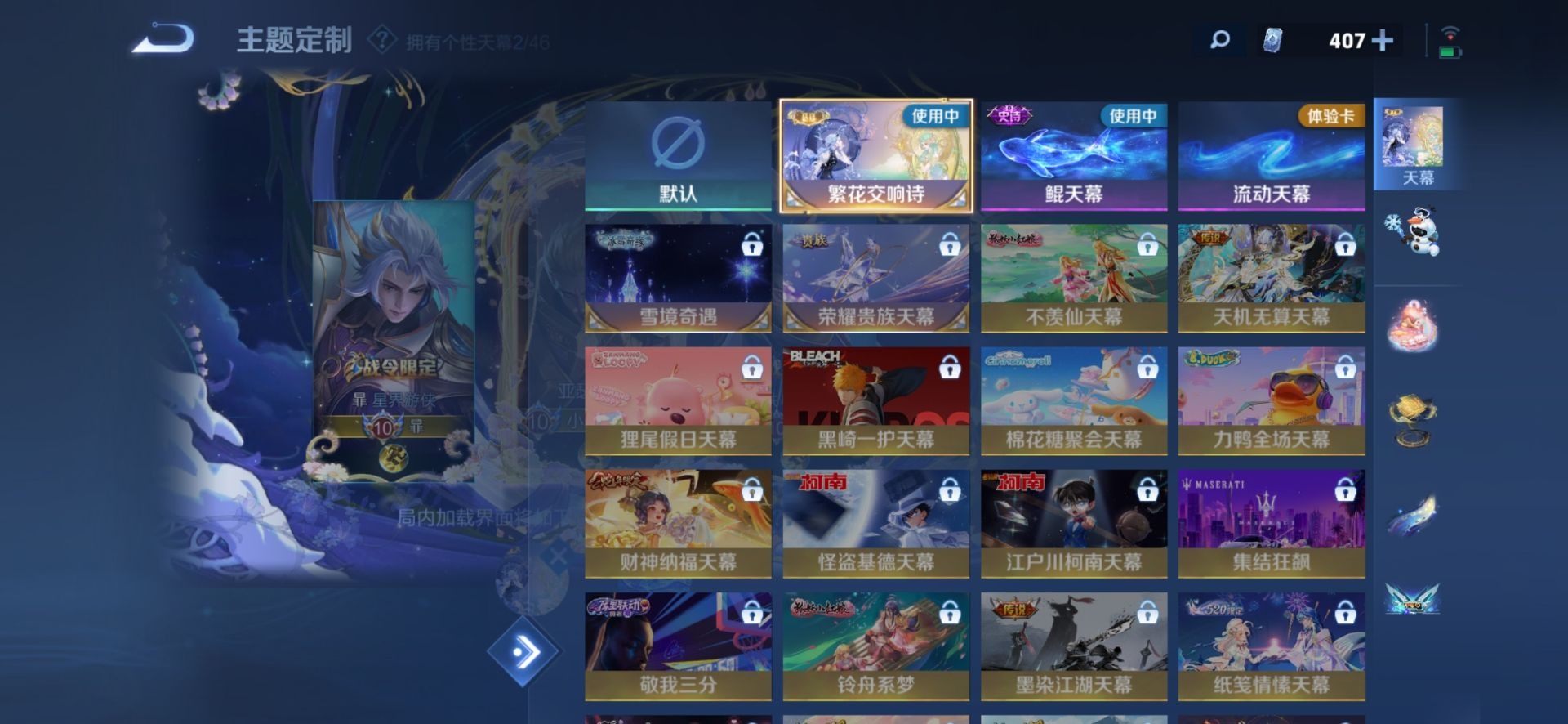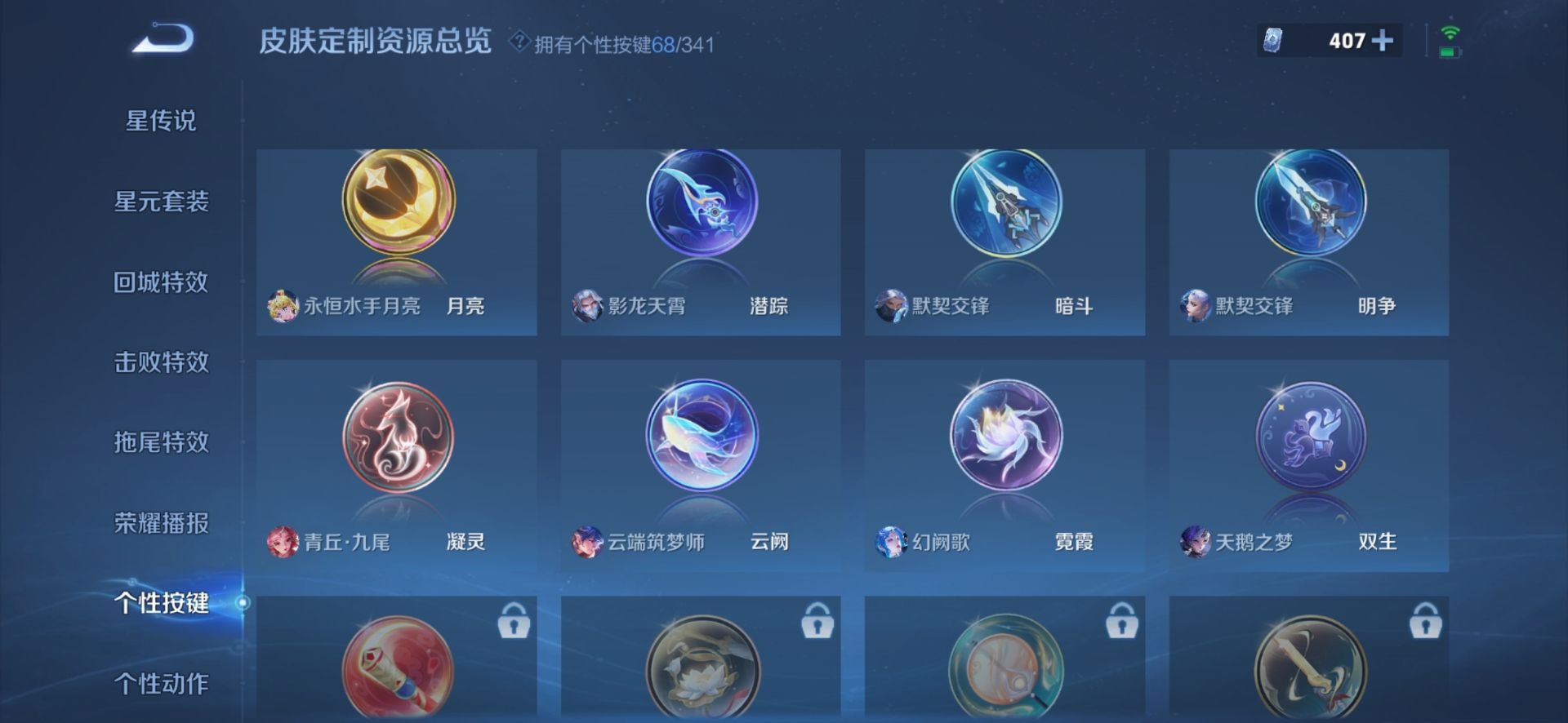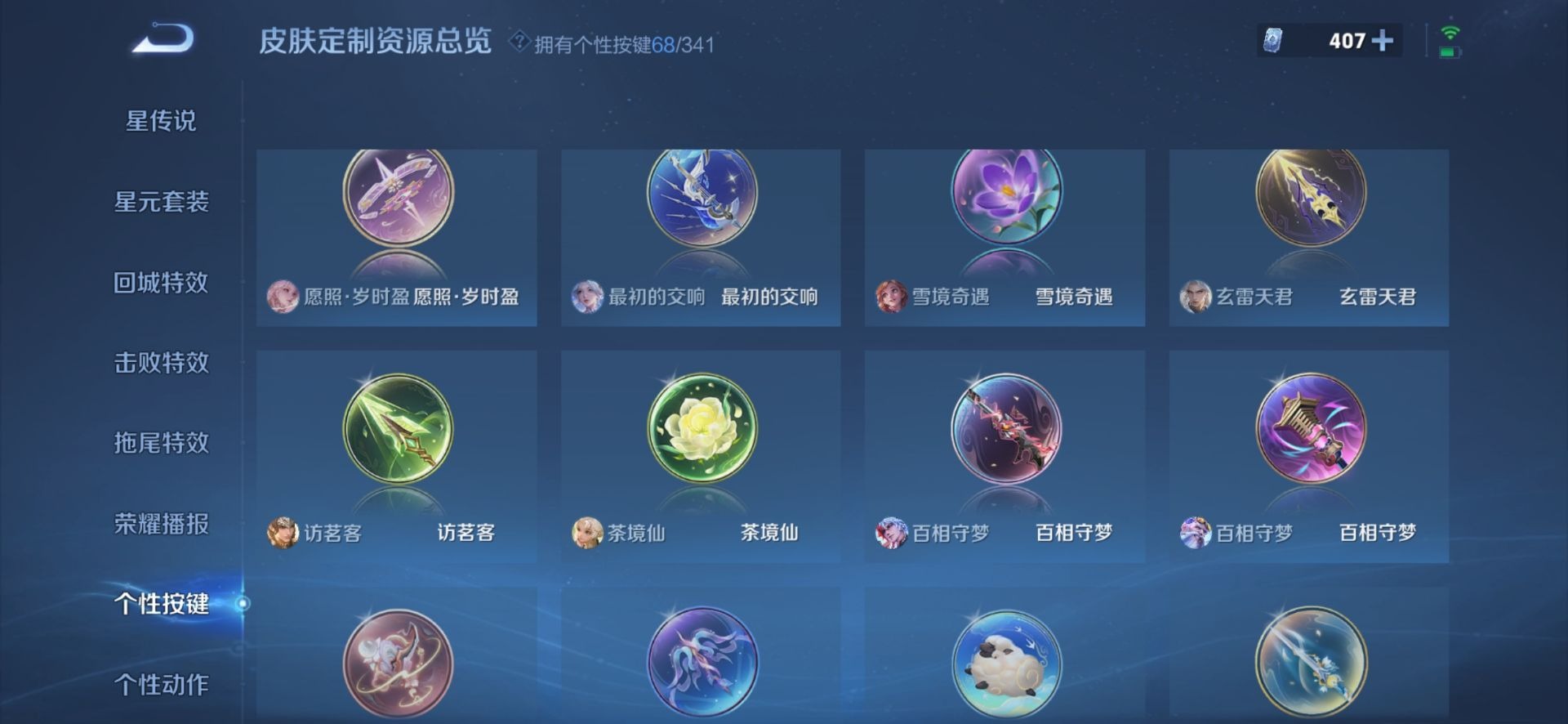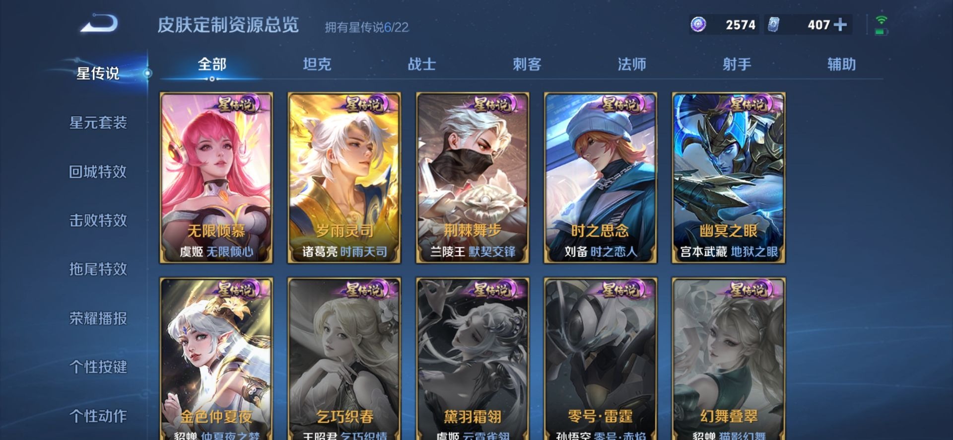 金蝉唐三藏,夏侯惇霜北刀,牛魔奔雷神使,露娜启示之音,露娜一生所爱,庄周云端筑梦师,诸葛亮时雨天司,司空震愿照·山河定,裴擒虎李小龙,上官婉儿梁祝,上官婉儿神器·万象笔,上官婉儿天狼绘梦者,花木兰默契交锋,马可波罗逐梦之星,孙悟空大圣娶亲,孙悟空至尊宝,韩信傲雪梅枪,墨子降魔,澜愿照·九州拓,虞姬愿照·岁时盈,嫦娥如梦令,王昭君凤凰于飞,王昭君映山客,大乔白鹤梁神女,哪吒逐梦之翼,铠青龙志,伽罗天狼溯光者,赵云百木心枪,孙膑天狼运算者,吕布御风骁将,后羿如梦令,后羿辉光之辰,兰陵王默契交锋,兰陵王影龙天霄,安琪拉魔法小厨娘,艾琳陌上桑,西施至美·乘鲤谣,桑启鸣野蒿,女娲愿照·千秋盛,百里玄策白虎志,赵云引擎之心,妲己时之彼端,妲己时之奇旅,妲己愿照·众生和,蔡文姬愿照·福禄聚,瑶山海·碧波行,娜可露露前尘镜,关羽冰锋战神