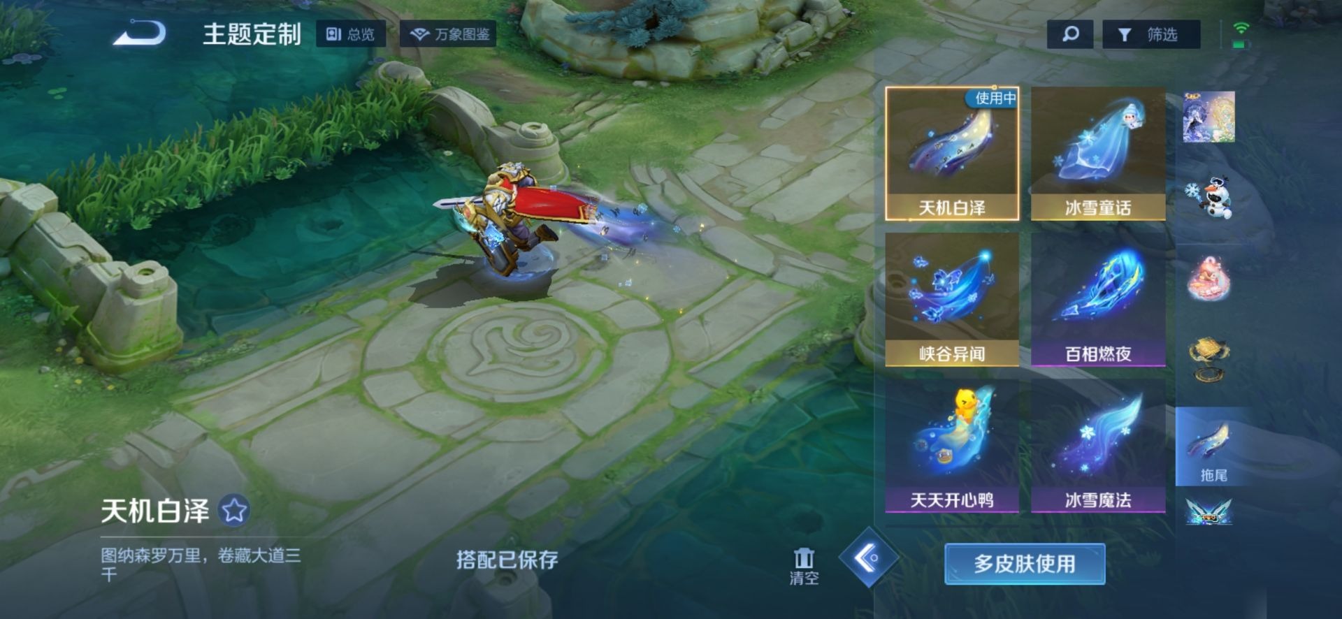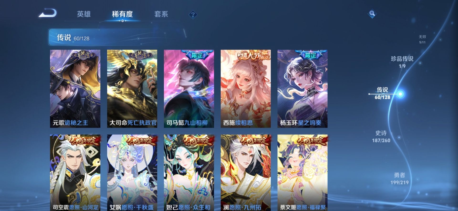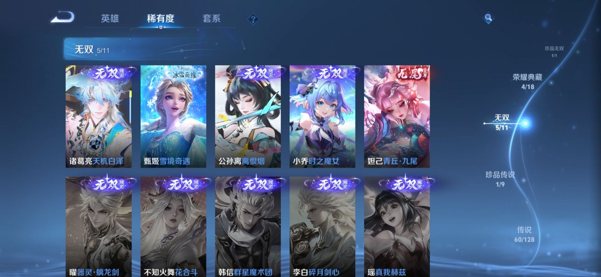 夏侯惇朔风刀,曹操烛龙,苏烈千军破阵,牛魔御旌,项羽苍威无极,镜青焰无极,庄周蜃楼王,裴擒虎擒涛扼浪,蒙犽狂想玩偶喵,马可波罗暗影游猎,鬼谷子原初探秘者,张良古海寻踪,芈月重明,扁鹊炼金王,虞姬凯尔特女王,刘邦夺宝奇兵,沈梦溪星空之诺,沈梦溪大漠名商,孙膑妖精王,典韦穷奇,典韦蓝屏警告,达摩沙漠行僧,鲁班七号狮舞东方,吕布猎兽之王,元歌云间偶戏,兰陵王金庭之子,鲁班大师探海日志,明世隐疑决卦,白起狰,亚瑟狮心王,女娲朔望之晖,桑启海盐诗旅,狄仁杰万华元夜,程咬金演武夺筹,李元芳银河之约,李元芳云中旅人,弈星混沌棋,钟馗神迹守卫,钟馗驱傩正仪,太乙真人饕餮