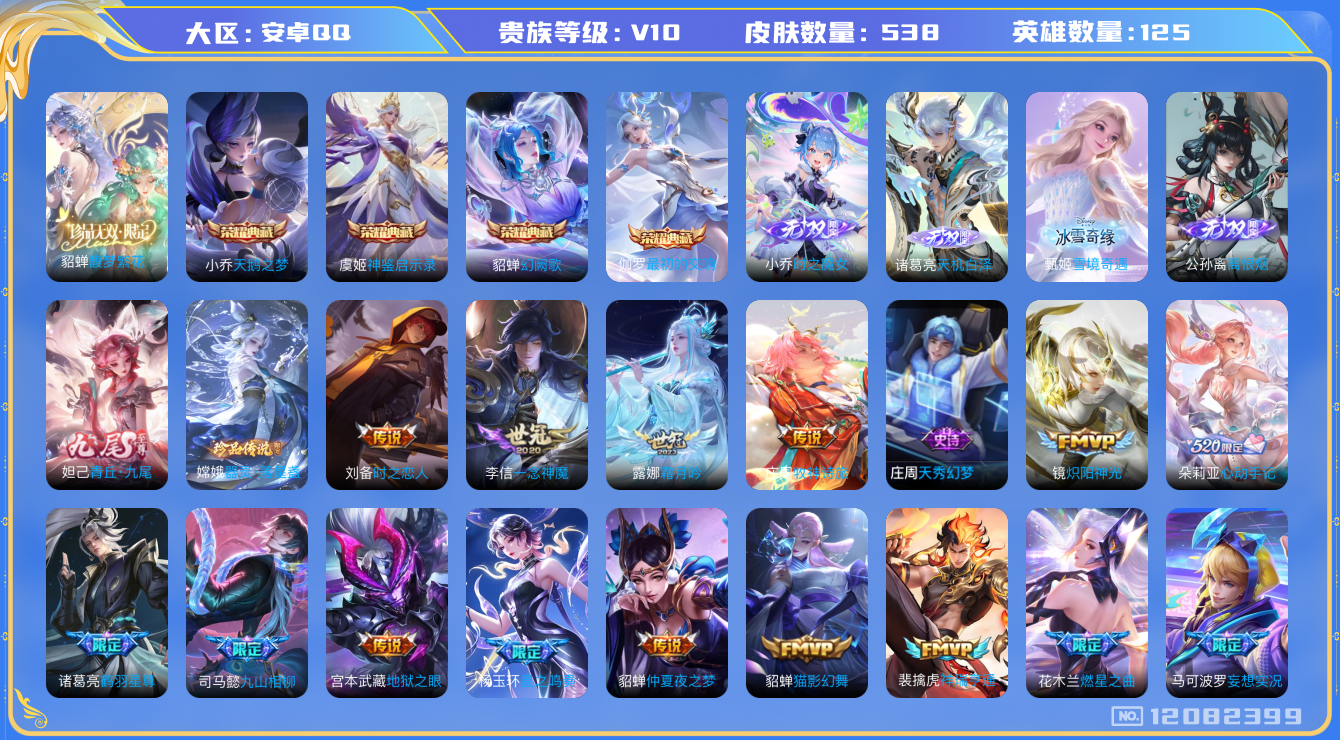 [12082399]V10 4典藏 1珍品无双 5无双 1珍品传说 60传说 125英雄 538皮肤 可修改实名 优质装备:馥梦繁花,天鹅之梦(小乔典藏),幻阙歌(貂蝉典藏),青丘·九尾(妲己无双),神鉴启示录,小乔时之魔女(小乔无双),离恨烟(公孙离无双),雪境奇遇-甄姬,最初的交响(伽罗典藏),天机白泽,器灵·落星盏,黄金狮子座,云鹰飞将(小将军),绛天战甲(鸡嘴战神),黄金白羊座,猫影幻舞,炽阳神光,一念神魔,仲夏夜之梦(大飞蛾),地狱之眼,时之恋人-刘备(电焊工),游龙清影(小青龙),末日机甲-孙策,花朝如约(花篮子),挚爱之约,挚爱花嫁,无双飞将,碎云,天秀幻梦,炽翼辉光(娃娃菜牛角包),燃星之曲,画中仙,浮生妄,青丘·九尾,鹤羽星尊,妄想实况,永恒水手月亮,夜礼服假面,小动物乐团,霜月吟,艾琳觅芳踪,黄金天蝎座,云中君群星魔术团,朵莉亚心动手记,牧神诗旅,玄雷天君,诡秘之主,涂山容容 传说皮:貂蝉曦玄引,死亡执政官,九山相柳,续相思,星之鸣奏,祥瑞亨通,幻光神枪 珍宝阁皮:优雅恋人,蔷薇恋人,玩趣恶龙 限定皮:愿照·九州拓(澜年限),愿照·福禄聚(蔡文姬年限),愿照·岁时盈(虞姬年限),愿照·山河定(司空震年限),愿照·众生和(妲己年限),愿照·千秋盛(女娲年限),逐霄战戟,映山客,陌上桑,鸣野蒿,夏侯惇霜北刀,至尊宝,白虎志(电光耗子),凤求凰(白切鸡),凤凰于飞,傲雪梅枪,前尘镜,时之彼端,白鹤梁神女,魔法小厨娘,时雨天司(水龙头),山海·碧波行(瑶年限),至美·乘鲤谣,影龙天霄,遇见飞天,高山流水,无限倾心-虞姬,怒海麟威,降魔,五谷丰年,青龙志(铠年限),冰锋战神,天狼运算者,游园惊梦,梁祝,御风骁将(吕布年限),逐梦之翼,逐梦之星,天狼溯光者,奔雷神使(牛魔年限),天狼绘梦者,李小龙,辉光之辰,如梦令-嫦娥,如梦令-后羿,默契交锋-兰陵王,默契交锋-花木兰,一生所爱,大圣娶亲,引擎之心,云端筑梦师,百木心枪,启示之音,唐三藏,时之奇旅-妲己,神器·万象笔 史诗皮:赞萌露比,鸭鸭历险记-刘禅,飞车小橘子,苍鳞隐世,器灵·浮梦炉,糖绘人间,狼魂孤将,绮世丹青,瑰影绮梦,化蝶舞,灵蛊蚀心,星界战将,谪仙醉月,龙之律动,雪豹·霜爪,藏狐·褐绒,布丁狗之誓,小牛鸭,石田雨龙,百相守梦-周瑜,戍鼓铭心,茶境仙,幻珠鲛人,怒海争锋,炽弈燎原,撼地雄心,破空之剑,战舞者,涂