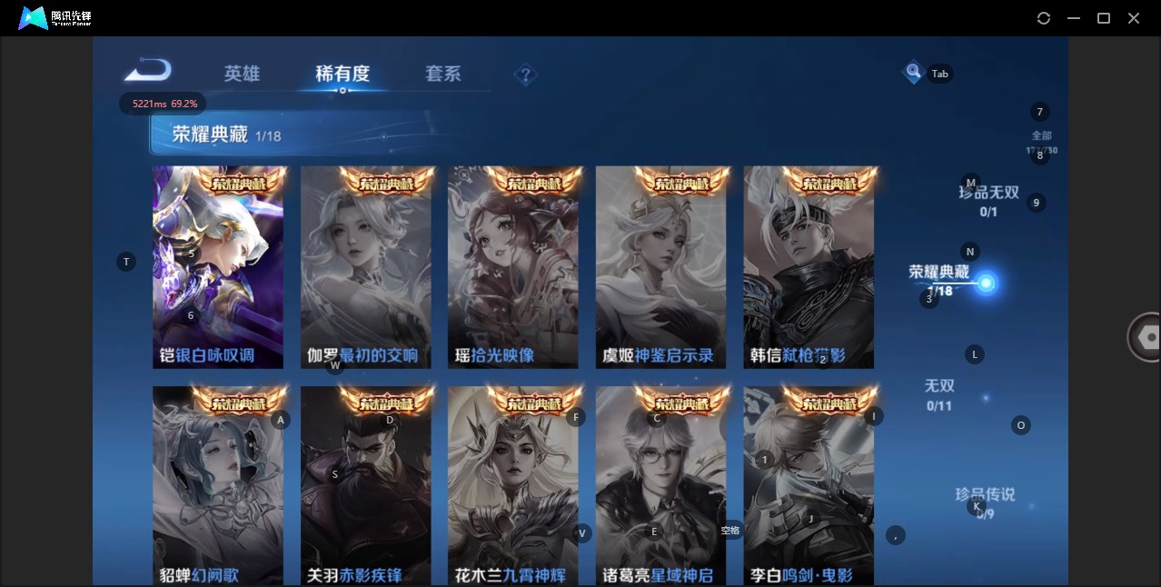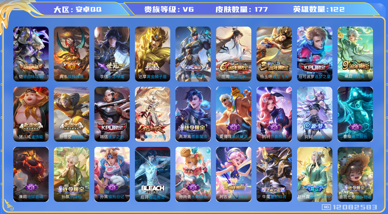 - [8956578]实名: 可修改 贵族等级: V7 英雄数: 123 皮肤数: 228 荣耀水晶: 无限飓风号 传说皮: 云鹰飞将,绛天战甲,一念神魔,无双飞将,幻光神枪 限定皮: 飞衡,青龙志,武陵仙君,如梦令-后羿,高山流水,孙行者,傲雪梅枪,百木心枪,五谷丰年,神器·万象笔,山海·玄木吟,鸣野蒿,愿照·山河定,愿照·岁时盈