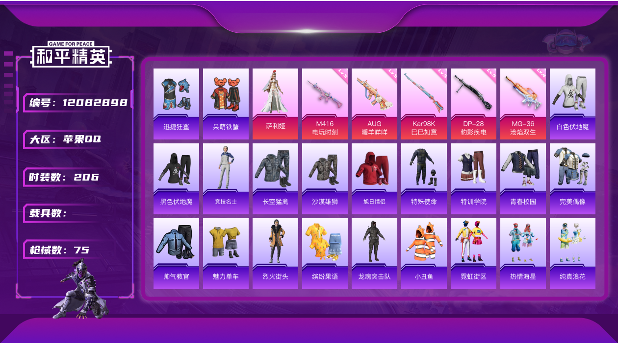 [12082898]1粉装 5特效枪 8印记 可二次 可修改实名 优质装备:M416电玩时刻,萨利娅,AUG-暖羊咩咩,Kar98K-巳巳如意 热门装扮:迅捷狂鲨,呆萌铁蟹 稀有枪皮:MG-36-沧焰双生,DP-28-豹影疾电 五级特效枪:五级Kar98K-巳巳如意,五级DP-28-豹影疾电,五级AUG-暖羊咩咩,五级M416-电玩时刻 四级特效枪:四级MG-36-沧焰双生 紫色装扮:SS22特训,SS23特训,SS21特训,SS31特训套装,旭日情侣,SS33特训套装,顶瓜瓜,长空猛禽,霓虹街区,青春校园,缤纷果语,绛羽幽主,魅力单车,黑色伏地魔,龙的传人,龟仙人,冰河战士,龙魂突击队,蝶变,香桃花海,沙漠雄狮,完美偶像,帅气教官,白色伏地魔,空岛之星,特殊使命,特训学院,SS29特训,纯真浪花,热情海星,SS28特训,异域银装,鱼渊荷华,燕燕于飞,巳巳如意,烈火街头,竞技名士,街头风暴,临安公主,SS24特训(SS24特训套装),SS25特训,SS27特训,小丑鱼,SS26特训,智谋强哥,SS32特训服(SS32特训套装),绯格组合,糖霜甜心,恋语绒绒 优质战备:精灵梦叶罗丽降落伞,幻彩电音降落伞,喜羊羊与灰太狼降落伞,鬼刀降落伞