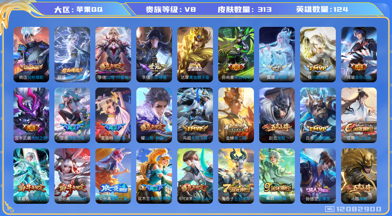 [12082900]V8 1典藏 1珍品传说 18传说 124英雄 313皮肤 可修改实名 优质装备:弑枪猎影(韩信典藏),器灵·落星盏,黄金狮子座,炽阳神光,一念神魔,末日机甲-孙尚香(绿蚂蚱),地狱之眼,音你心动-周瑜,无双飞将,山海·炽霜斩(李信年限),山海·苍雷引(电光曜子),浮生妄,霜月吟 传说皮:落雪白狼 珍宝阁皮:妄想食味,优雅恋人,蔷薇恋人 限定皮:愿照·九州拓(澜年限),鸣野蒿,至尊宝,傲雪梅枪,时雨天司(水龙头),神威(电光马子),高山流水,怒海麟威,五谷丰年,冰锋战神,龙胆,祈雪灵祝(雪兔子),朱雀志(守约年限),青春决赛季,蜜橘之夏,唐三藏,山海·玄木吟(马可年限) 史诗皮:星界战将,龙之律动,雪豹·霜爪,茶境仙,东方月初,蒙犽顽岩魄,蔬乡物语(鲁班七号),紫霞仙子,苍穹之光,电玩小子(小书包),黄金分割率,特工魅影,永昼,匿光破解者,百相守梦(刘备),电玩·爆裂旋风,真我赫兹(镜),真我赫兹(百里守约),江河有灵,百解令(蒙犽),高渐离燃音魔法,蒙恬荣光圣徽,偶像歌手,魅语,晚萤,冰冠公主,末日机甲-吕布,猫狗日记-孙策,猫狗日记-大乔,乱世虎臣,节奏热浪,女仆咖啡,摇滚巨星,水果甜心,绅士熊喵,天才门将,星夜王子,心灵骇客,功夫厨神,德古拉伯爵,暗隐猎兽者,幽灵船长,鬼剑武藏,暗渊魔法,舞动绿茵,地狱岩魂,缤纷独角兽,乘风破浪,逐浪之夏,月团寄思,水晶猎龙者,曙光守护者,箭羽风息,金属风暴,原初追逐者,圣诞恋歌,鹰眼统帅,魅力维加斯,黎明之约,雪上飞焰,赏金猎手,奇遇舞章,无心