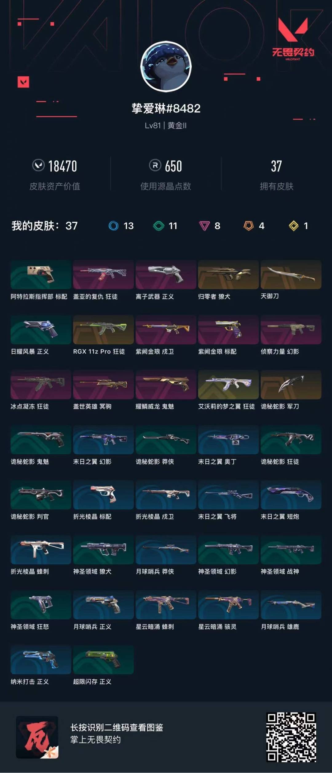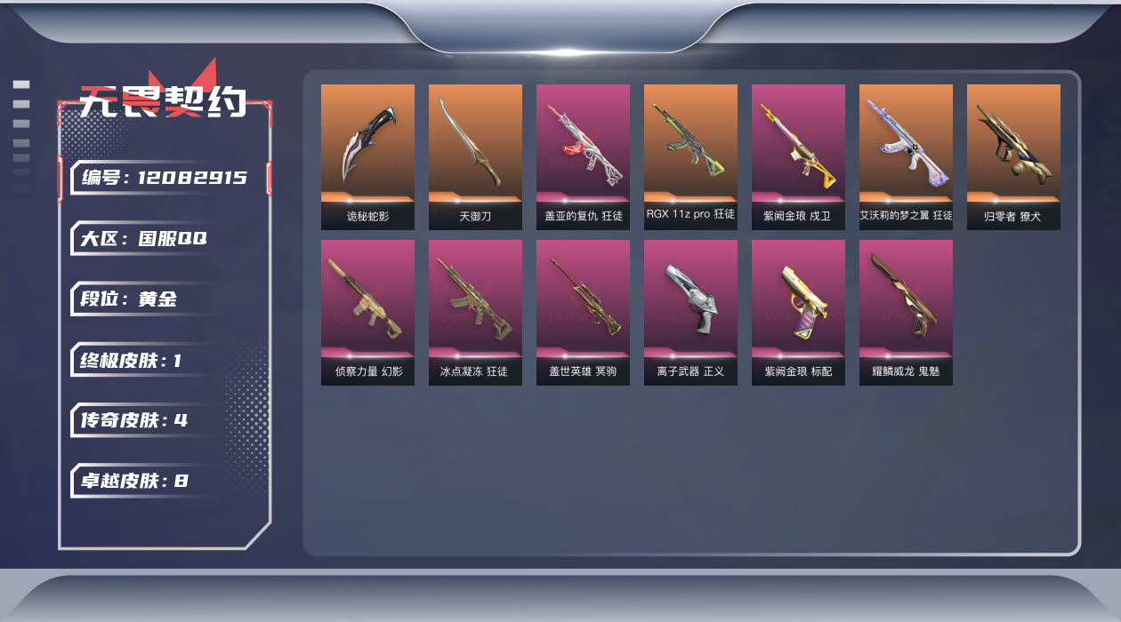 [12082915]4橙皮 1金皮 8紫皮 37皮肤 26英雄 61卡面 650已用源晶 黄金 优质装备:狂徒-艾沃莉的梦之翼,狂徒-盖亚的复仇,幻影-侦察力量,獠犬-归零者,正义-离子武器,标配-紫阙金琅,狂徒-冰点凝冻,天御刀,诡秘蛇影,戍卫-紫阙金琅,鬼魅-耀鳞威龙 步枪皮肤:RGX 11z pro 狂徒 狙击枪皮肤:冥驹-盖世英雄