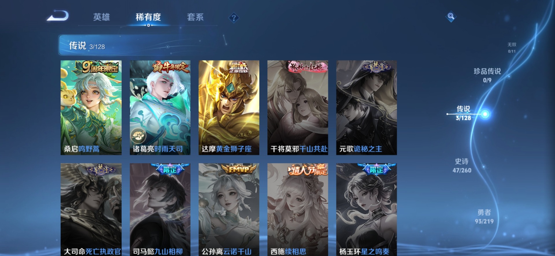 夏侯惇朔风刀,老夫子醍醐杖,沈梦溪星空之诺,沈梦溪大漠名商,盾山御銮,达摩沙漠行僧,元歌云间偶戏,兰陵王金庭之子,裴擒虎擒涛扼浪,鲁班大师探海日志,明世隐疑决卦,鬼谷子原初探秘者,张良古海寻踪,桑启海盐诗旅,狄仁杰万华元夜,程咬金演武夺筹,李元芳银河之约,李元芳云中旅人,弈星混沌棋,钟馗驱傩正仪