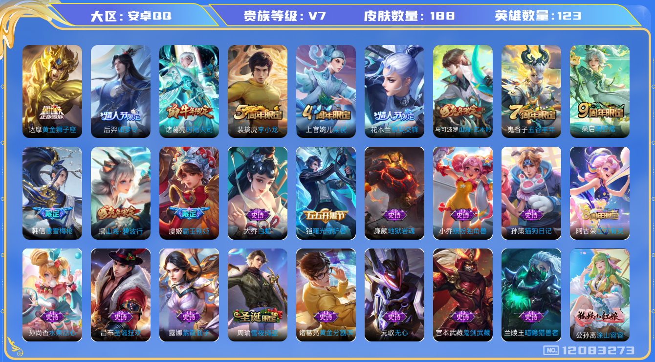 [12083273]V7 3传说 123英雄 188皮肤 可修改实名 优质装备:黄金狮子座,涂山容容 珍宝阁皮:蔷薇恋人,玩趣恶龙 限定皮:鸣野蒿,傲雪梅枪,时雨天司(水龙头),山海·碧波行(瑶年限),五谷丰年,梁祝,李小龙,如梦令-后羿,霸王别姬-虞姬,默契交锋-花木兰,山海·玄木吟(马可年限) 史诗皮:紫霞仙子,黄金分割率,特工魅影,江河有灵,雪夜绮愿(周瑜),蒙恬荣光圣徽,偶像歌手,白蛇,猫狗日记-孙策,修罗,水果甜心,功夫厨神,暗隐猎兽者,鬼剑武藏,心灵战警,地狱岩魂,纤云弄巧,繁星吟游(呼啦呼啦),拒霜思,缤纷独角兽,逐浪之夏,曙光守护者,金属风暴,原初追逐者,圣诞狂欢,鹰眼统帅,暗夜贵公子,赏金猎手,无心,未来纪元-赵云