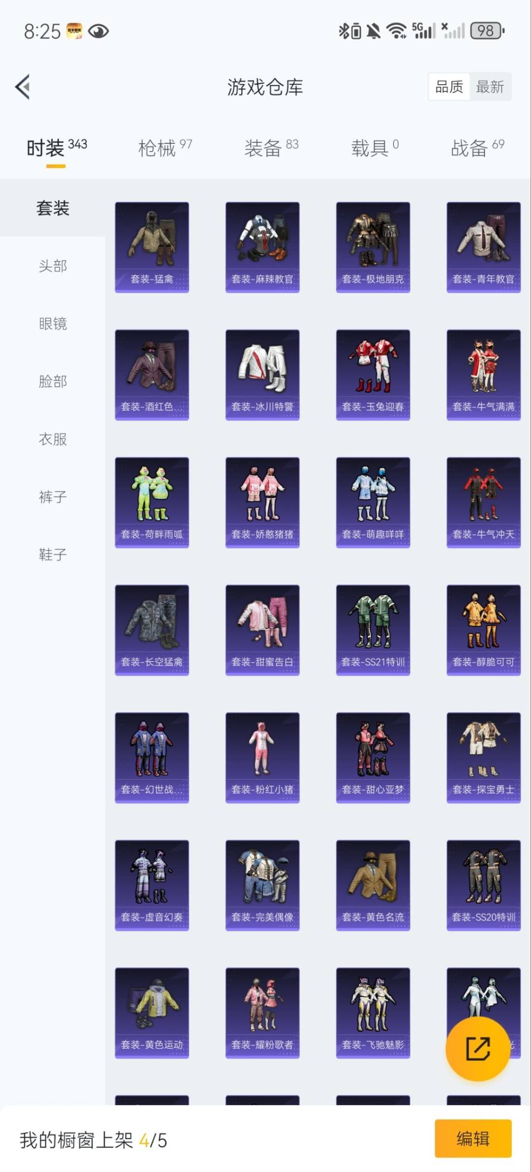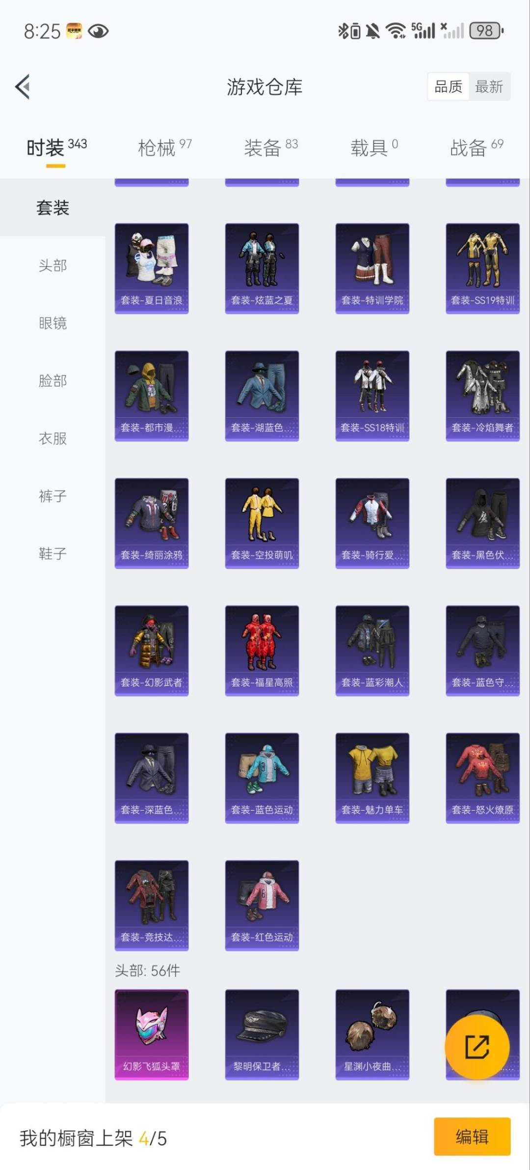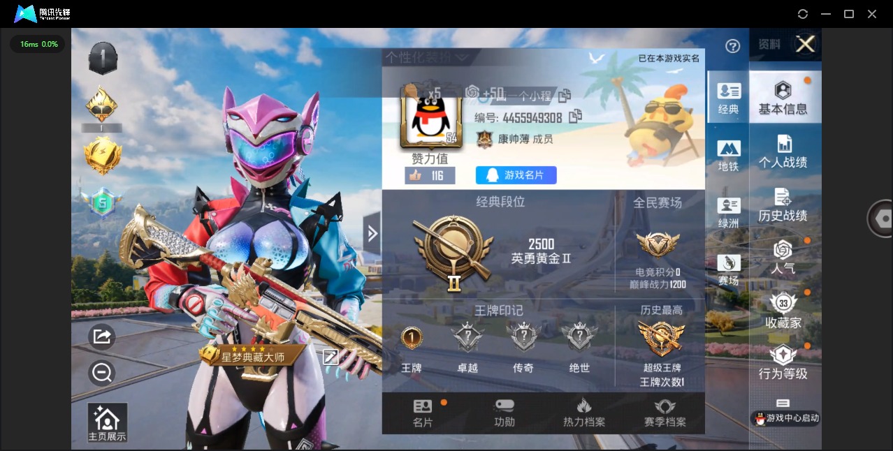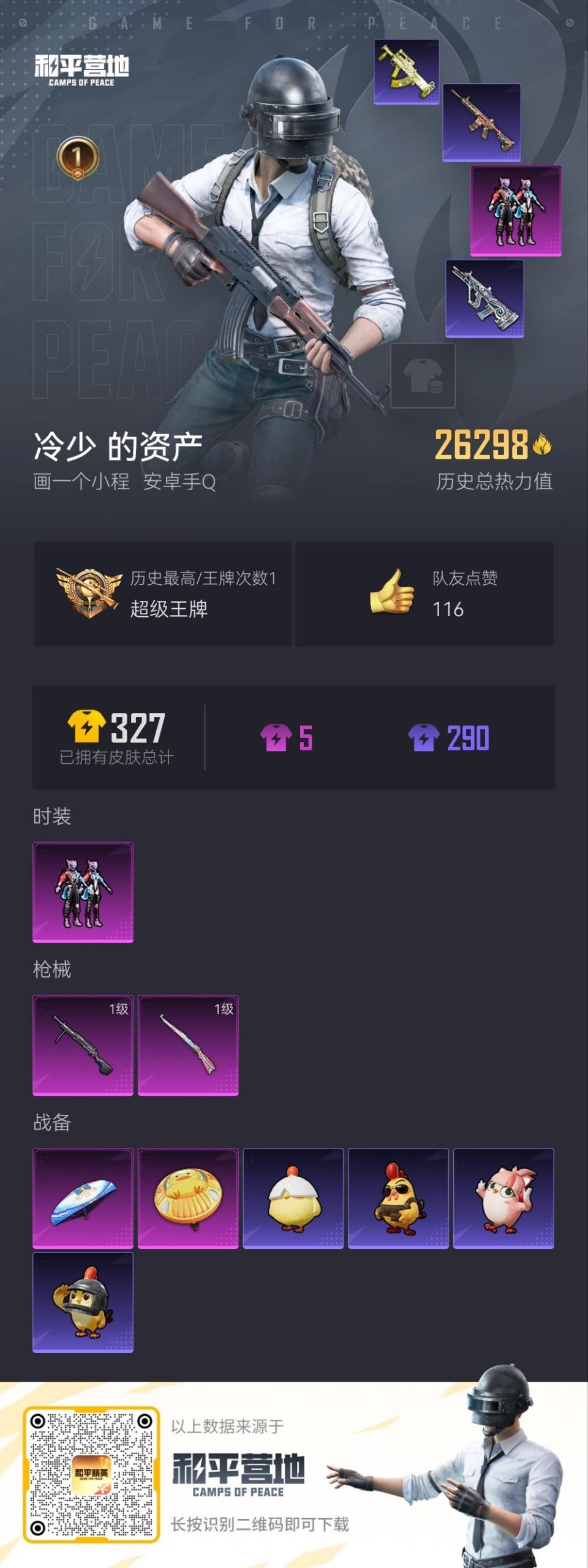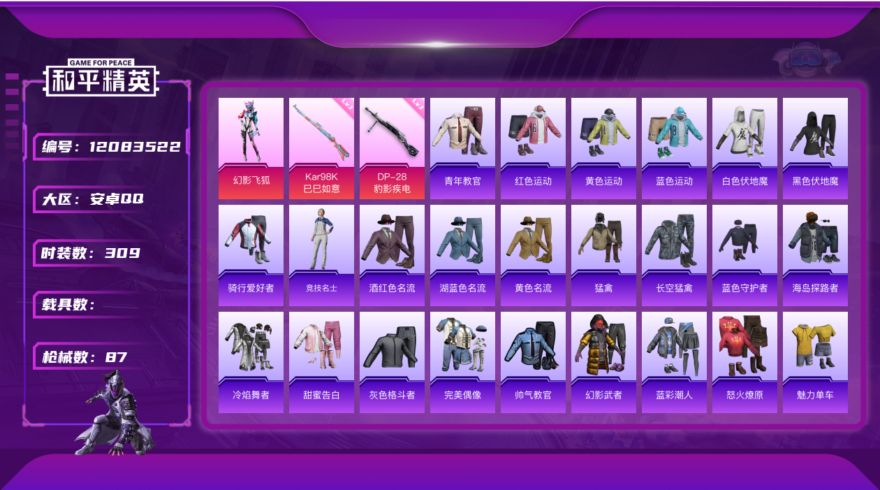 [12083522]实名: 可修改 时装数: 309 枪械数: 87 热门装扮: 幻影飞狐 稀有枪皮: Kar98K-巳巳如意,DP-28-豹影疾电