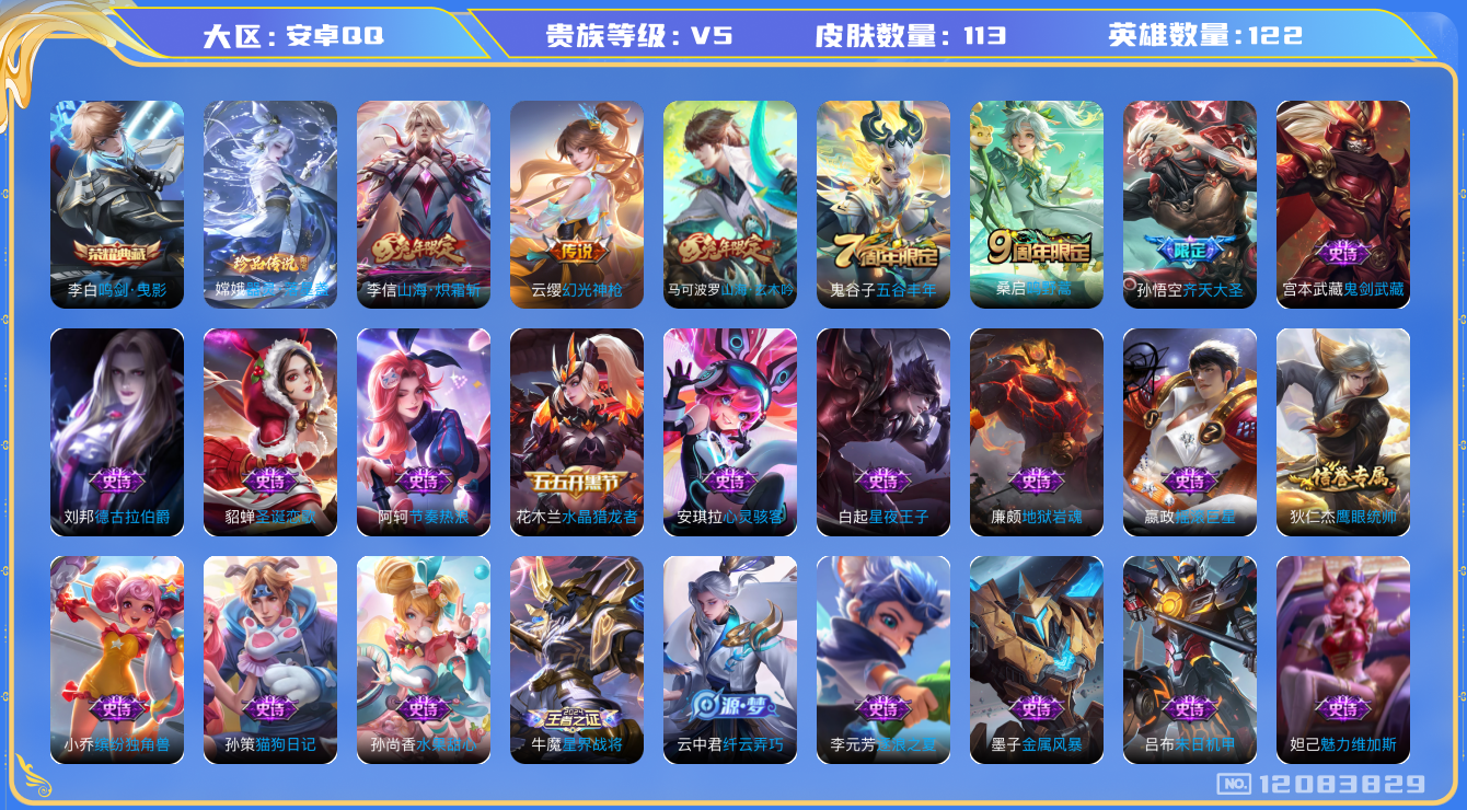 - [11407385]无双贵族 5典藏 36传说 123英雄 354皮肤 典藏英雄武则天 可修改实名 优质装备:倪克斯神谕(宇宙婆娘),无限飓风号(高达),大秦宣太后,鸣剑·曳影,银白咏叹调(倪克斯侍卫),冠军飞将,绛天战甲(鸡嘴战神),猫影幻舞,久胜战神,末日机甲-孙尚香(绿蚂蚱),地狱火,仲夏夜之梦(大飞蛾),音你心动-小乔,零号·赤焰,海洋之心,地狱之眼,胖达荣荣,李逍遥,乞巧织情,时之恋人-刘备(电焊工),游龙清影(小青龙),超时空战士-狄仁杰,花朝如约(花篮子),山海·炽霜斩(李信年限),山海·琳琅生(小乔年限),山海·苍雷引(电光曜子),艾琳觅芳踪 珍宝阁皮:优雅恋人,玩趣恶龙 限定皮:至尊宝,太华(伽罗年限),异界灵契(白毛香),傲雪梅枪,补天,寅虎·展翼(孙膑年限),白鹤梁神女,白晶晶,时雨天司(水龙头),神威(电光马子),玄嵩(庄周年限),山海·碧波行(瑶年限),遇见飞天,高山流水,齐天大圣,匿光决锋者,五谷丰年,武圣,天狼运算者,游园惊梦,御风骁将(吕布年限),天狼溯光者,奔雷神使(牛魔年限),祈雪灵祝(雪兔子),天狼绘梦者,李小龙,逐梦之影,如梦令-嫦娥,如梦令-后羿,霸王别姬-项羽,霸王别姬-虞姬,孙行者,猪悟能,一生所爱,天魔缭乱,青春决赛季,乒乒小将,蜜橘之夏,神奇女侠,匿光追影者,女儿国国王,寅虎·御盾(廉颇年限),寅虎·瑞焰(虎皮蛋子),寅虎·心曲(虎婆),寅虎·赤拳(老虎年限),时之祈愿-云中君,时之祈愿-瑶(瑶传限),百木心枪,玉兔公主,启示之音,无尽星芒,山海·玄木吟(马可年限) 史诗皮:紫霞仙子,苍穹之光,白龙吟,黄金分割率,特工魅影,千年之狐,永昼,江河有灵,魅语,无限星赏官,冰冠公主,偶像歌手,晚萤,暗夜猫娘,龙骑士(小龙虾),末日机甲-吕布,猫狗日记-孙策,时之恋人-孙尚香,乱世虎臣,节奏热浪,修罗,女仆咖啡,摇滚巨星,水果甜心,绅士熊喵,天才门将,星夜王子,心灵骇客,时之奇旅-安琪拉,功夫厨神,德古拉伯爵,暗隐猎兽者,幽灵船长,鬼剑武藏,心灵战警,天秀·启明,舞动绿茵,地狱岩魂,纤云弄巧,繁星吟游(呼啦呼啦),拒霜思,缤纷独角兽,乘风破浪,逐浪之夏,水晶猎龙者,曙光守护者,金属风暴,圣诞狂欢,圣诞恋歌,鹰眼统帅,魅力维加斯,黎明之约,赏金猎手,奇遇舞章,天秀·音浪,寅虎·御盾,千筹问战,无心,未来纪元-赵云