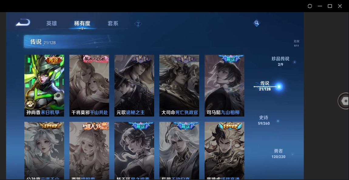 - [11713857]V8 1典藏 1珍品传说 11传说 124英雄 169皮肤 可修改实名 优质装备:弑枪猎影(韩信典藏),黑崎一护,云鹰飞将(小将军),久胜战神,一念神魔,末日机甲-孙尚香(绿蚂蚱),胖达荣荣 珍宝阁皮:玩趣恶龙 限定皮:至尊宝,白虎志(电光耗子),凤求凰(白切鸡),太华(伽罗年限),时之彼端,时雨天司(水龙头),梁祝,龙胆,岱宗(典韦年限),虎魄,天狼征服者,李小龙,辉光之辰,天魔缭乱 史诗皮:鸭鸭历险记-刘禅,龙之律动,紫霞仙子,黄金分割率,特工魅影,千年之狐,魅语,无限星赏官,冰冠公主,晚萤,龙骑士(小龙虾),猫狗日记-孙策,时之恋人-孙尚香,乱世虎臣,节奏热浪,修罗,摇滚巨星,水果甜心,星夜王子,心灵骇客,暗隐猎兽者,心灵战警,乐园奇幻夜,舞动绿茵,地狱岩魂,纤云弄巧,繁星吟游(呼啦呼啦),缤纷独角兽,乘风破浪,逐浪之夏,水晶猎龙者,曙光守护者,金属风暴,圣诞恋歌,鹰眼统帅,魅力维加斯