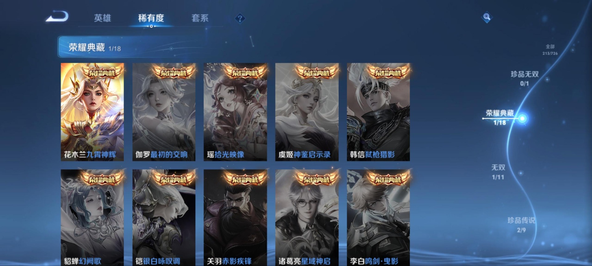 刘备时之恋人,赵云淬星耀世,干将莫邪久胜战神,李信一念神魔,孙策挚爱之约,达摩黄金狮子座,吕布遇见神鼓,镜炽阳神光,西施游龙清影,张良黄金白羊座,曜云鹰飞将,曜李逍遥,马超无双飞将,虞姬云霓雀翎