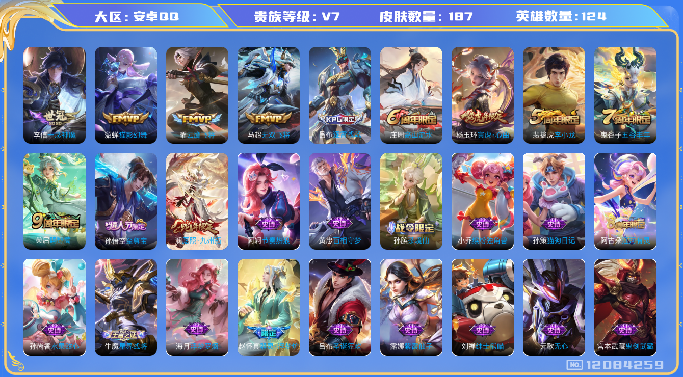 [12084259]V7 6传说 124英雄 187皮肤 可修改实名 女号 优质装备:云鹰飞将(小将军),猫影幻舞,一念神魔,无双飞将 珍宝阁皮:蔷薇恋人,女武神 限定皮:愿照·九州拓(澜年限),逐霄战戟,鸣野蒿,至尊宝,高山流水,五谷丰年,李小龙,寅虎·心曲(虎婆) 史诗皮:器灵·浮梦炉,星界战将,茶境仙,超元猎域,百相守梦-黄忠,紫霞仙子,特工魅影,千年之狐,江河有灵,浮梦罗烟,蒙恬荣光圣徽,偶像歌手,晚萤,龙骑士(小龙虾),猫狗日记-孙策,节奏热浪,修罗,女仆咖啡,摇滚巨星,水果甜心,绅士熊喵,星夜王子,暗隐猎兽者,鬼剑武藏,心灵战警,缤纷独角兽,逐浪之夏,水晶猎龙者,金属风暴,原初追逐者,圣诞狂欢,鹰眼统帅,暗夜贵公子,魅力维加斯,赏金猎手,无心