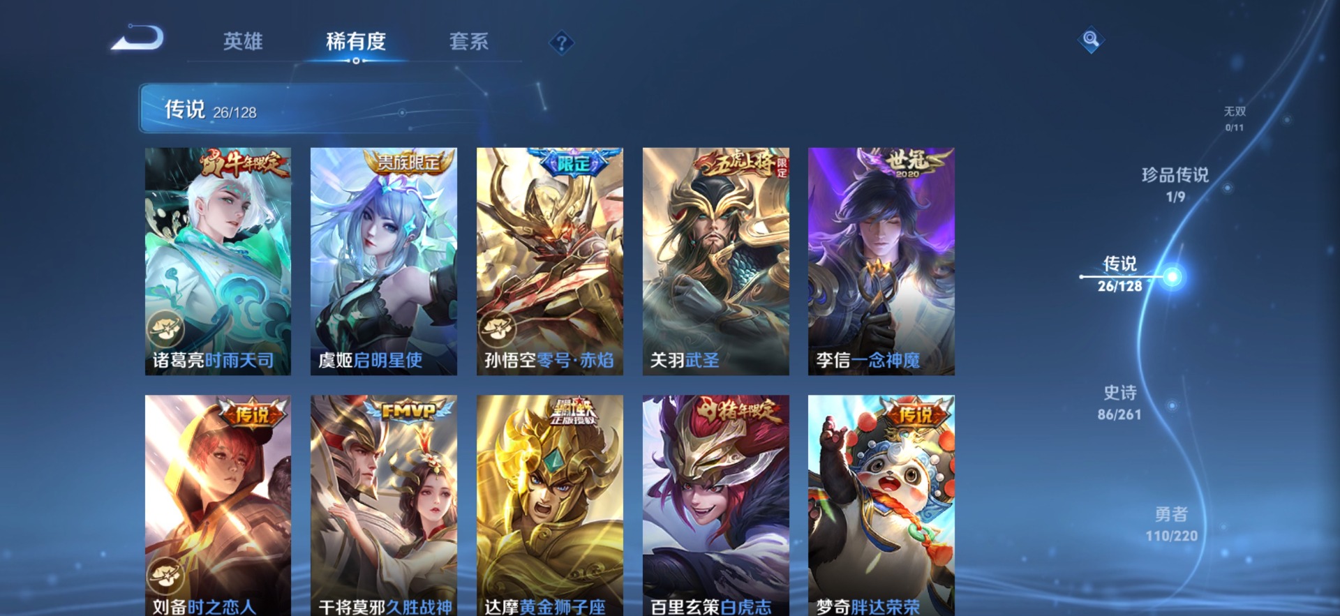 - [12229904]V7 1典藏 5传说 125英雄 272皮肤 可修改实名 优质装备:银白咏叹调(倪克斯侍卫),地狱火,地狱之眼 珍宝阁皮:妄想食味,玩趣恶龙 限定皮:愿照·九州拓(澜年限),鸣野蒿,傲雪梅枪,高山流水,五谷丰年,梁祝,御风骁将(吕布年限),天狼溯光者,李小龙,引擎之心,天魔缭乱 史诗皮:鸭鸭历险记-刘禅,星界战将,茶境仙,蔬乡物语(鲁班七号),百相守梦-百里守约,百相守梦-黄忠,紫霞仙子,电玩小子(小书包),黄金分割率,特工魅影,千年之狐,江河有灵,雪夜绮愿(周瑜),百解令(蒙犽),高渐离燃音魔法,蒙恬荣光圣徽,偶像歌手,暗夜猫娘,猫狗日记-孙策,猫狗日记-大乔,乱世虎臣,修罗,女仆咖啡,摇滚巨星,水果甜心,天才门将,心灵骇客,功夫厨神,德古拉伯爵,暗隐猎兽者,幽灵船长,鬼剑武藏,心灵战警,乐园奇幻夜,天秀·启明,舞动绿茵,地狱岩魂,纤云弄巧,繁星吟游(呼啦呼啦),拒霜思,缤纷独角兽,乘风破浪,月团寄思,水晶猎龙者,曙光守护者,金属风暴,原初追逐者,圣诞狂欢,圣诞恋歌,鹰眼统帅,王者之锤,暗夜贵公子,魅力维加斯,黎明之约