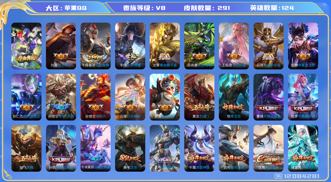 [12084281]V8 1珍品传说 26传说 124英雄 291皮肤 可修改实名 优质装备:黄金狮子座,黄金射手座,久胜战神,一念神魔,末日机甲-孙尚香(绿蚂蚱),地狱火,仲夏夜之梦(大飞蛾),零号·赤焰,胖达荣荣,乞巧织情,时之恋人-刘备(电焊工),超时空战士-狄仁杰 珍品传说:时之奇旅-孙策 传说皮:幻光神枪 珍宝阁皮:优雅恋人,玩趣恶龙 限定皮:愿照·九州拓(澜年限),愿照·福禄聚(蔡文姬年限),愿照·岁时盈(虞姬年限),愿照·山河定(司空震年限),愿照·众生和(妲己年限),愿照·千秋盛(女娲年限),逐霄战戟,鸣野蒿,至尊宝,白虎志(电光耗子),武陵仙君(小桃花),时雨天司(水龙头),神威(电光马子),飞衡(韩信年限),高山流水,青龙志(铠年限),武圣,天狼运算者,梁祝,御风骁将(吕布年限),烈魂,岱宗(典韦年限),天狼溯光者,虎魄,天狼征服者,奔雷神使(牛魔年限),祈雪灵祝(雪兔子),天狼绘梦者,李小龙,默契交锋-花木兰,冰霜恋舞曲,神奇女侠,山海·玄木吟(马可年限) 史诗皮:苍鳞隐世,器灵·浮梦炉,茶境仙,紫霞仙子,苍穹之光,白龙吟,黄金分割率,特工魅影,千年之狐,江河有灵,真我赫兹(百里守约),魅语,蒙恬荣光圣徽,青蛇,偶像歌手,电玩·爆裂旋风,末日机甲-吕布,猫狗日记-孙策,时之恋人-孙尚香,乱世虎臣,节奏热浪,修罗,女仆咖啡,摇滚巨星,水果甜心,天才门将,星夜王子,心灵骇客,功夫厨神,德古拉伯爵,暗隐猎兽者,幽灵船长,鬼剑武藏,心灵战警,天秀·启明,舞动绿茵,地狱岩魂,纤云弄巧,繁星吟游(呼啦呼啦),拒霜思,缤纷独角兽,乘风破浪,逐浪之夏,水晶猎龙者,曙光守护者,箭羽风息,金属风暴,原初追逐者,圣诞狂欢,圣诞恋歌,鹰眼统帅,暗夜贵公子,黎明之约,未来纪元-赵云