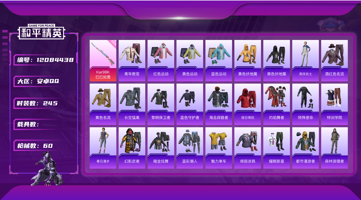 [12084438]1特效枪 3印记 可二次 可修改实名 优质装备:Kar98K-巳巳如意 五级特效枪:五级Kar98K-巳巳如意 紫色装扮:SS31特训套装,SS33特训套装,旭日情侣,SS22特训,吉莉礼服,幻世战舞者,幻影武者,冰川特警,SS16特训,SS17特训,萌趣颜团子,SS15特训,SS20特训,SS18特训,SS19特训,黄色名流,青年教官,魅力单车,鹤鸣,黄色伏地魔,黄色运动,黎明保卫者,黑色伏地魔,霓虹街区,都市漫游者,都市魅力,酒红色名流,长空猛禽,暖暖向日葵,深蓝色名流,灼焰舞者,海岛探路者,探宝勇士,暗金炫舞,极速红龙,格斗先锋,红色运动,绮丽涂鸦,缤纷果语,耀眼新星,蓝彩潮人,蓝色守护者,蓝色运动,虎虎生威吉莉,特殊使命,特训学院,王牌教练,福星高照,鱼渊荷华,燕燕于飞,巳巳如意,森林游猎者,异域银装,竞技名士,SS26特训,耀粉歌者,星影赞美诗,SS32特训服(SS32特训套装),春日漫步,绯格组合,白糯汤圆,恋语绒绒,海上生明月