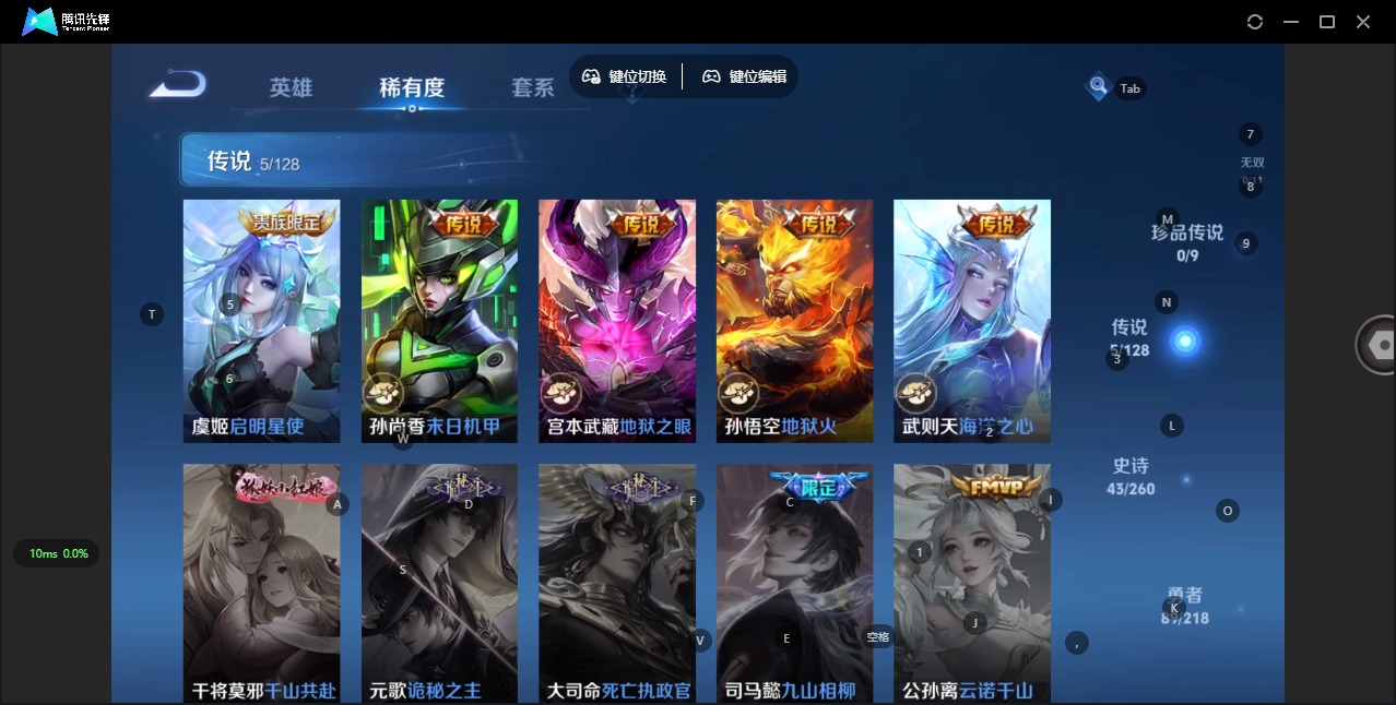 - [11625250]V6 1典藏 1传说 124英雄 189皮肤 可修改实名 优质装备:赤影疾锋,猫影幻舞 珍宝阁皮:优雅恋人,蔷薇恋人 限定皮:至尊宝,遇见飞天,五谷丰年,梁祝,御风骁将(吕布年限),李小龙,逐梦之影,猪悟能,大圣娶亲,美猴王 史诗皮:电玩小子(小书包),特工魅影,千年之狐,江河有灵,冰冠公主,电玩·爆裂旋风,龙骑士(小龙虾),水果甜心,德古拉伯爵,暗隐猎兽者,鬼剑武藏,舞动绿茵,纤云弄巧,繁星吟游(呼啦呼啦),缤纷独角兽,乘风破浪,水晶猎龙者,金属风暴,圣诞恋歌,鹰眼统帅,魅力维加斯,无心