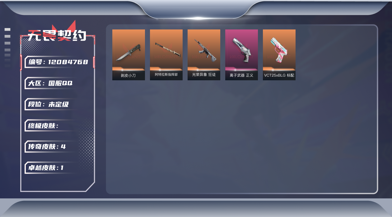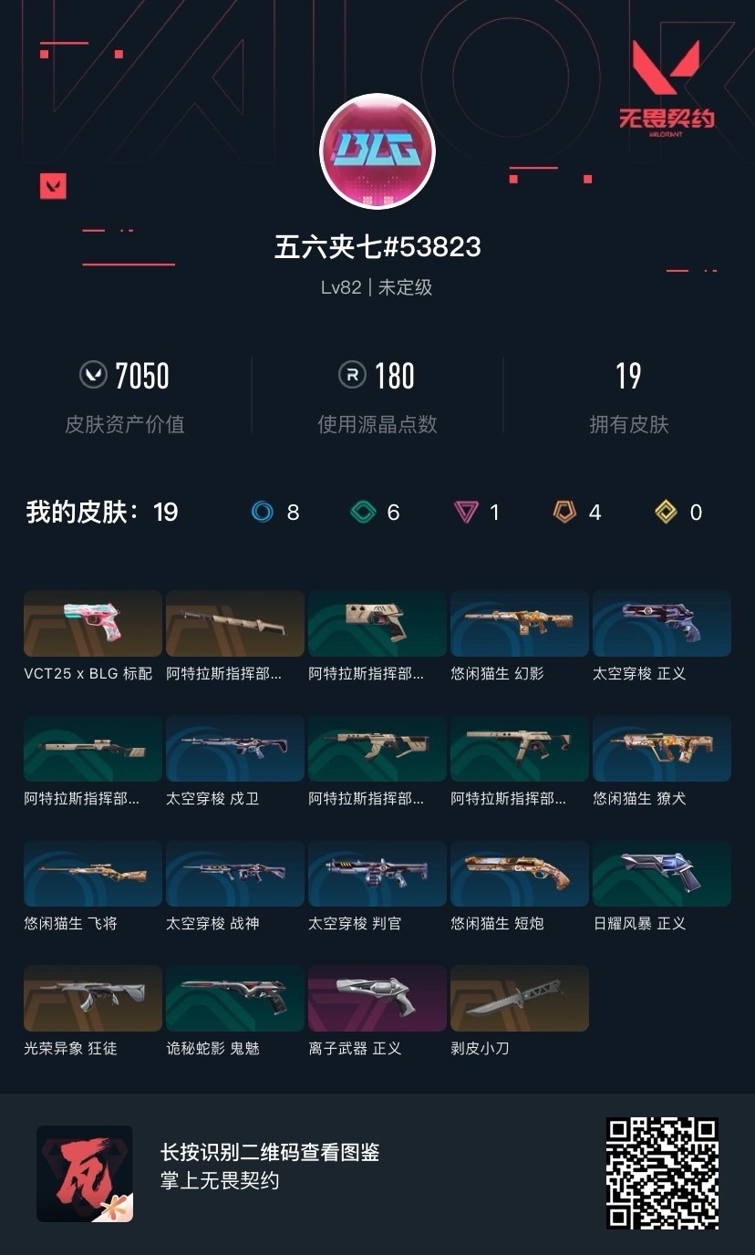 [12084768]4橙皮 1紫皮 19皮肤 18英雄 40卡面 180已用源晶 未定级 优质装备:正义-离子武器,剥皮小刀,阿特拉斯指挥部 佩枪皮肤:标配-VCT25xBLG 步枪皮肤:狂徒-光荣异象