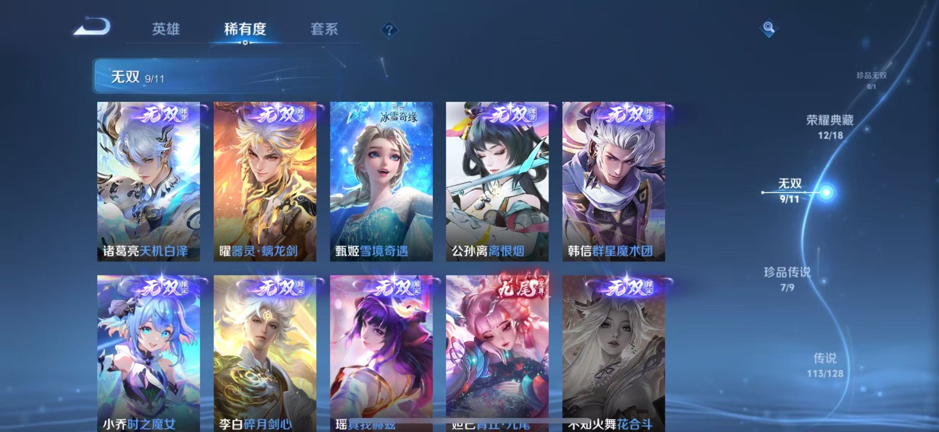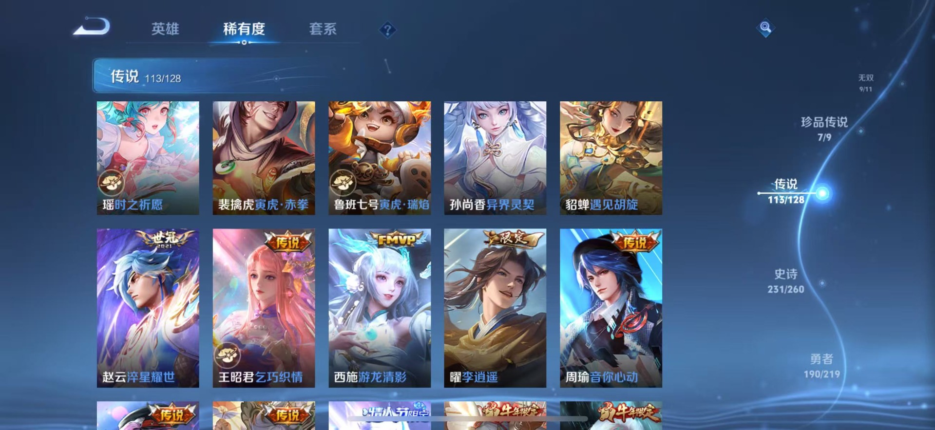 金蝉唐三藏,夏侯惇匿光决锋者,黄忠烈魂,苏烈玄武志,小乔纯白花嫁,孙尚香异界灵契,不知火舞绯月行,牛魔奔雷神使,项羽霸王别姬,露娜启示之音,露娜一生所爱,庄周玄嵩,镜匿光追影者,庄周云端筑梦师,周瑜真爱至上,诸葛亮时雨天司,杨玉环寅虎·心曲,司空震愿照·山河定,貂蝉逐梦之音,裴擒虎李小龙,裴擒虎天狼狩猎者,裴擒虎寅虎·赤拳,东皇太一逐梦之光,上官婉儿神器·万象笔,上官婉儿天狼绘梦者,花木兰默契交锋,花木兰瑞麟志,花木兰青春决赛季,马可波罗逐梦之星,马可波罗山海·玄木吟,马可波罗深海之息,猪八戒猪悟能,孙悟空孙行者,孙悟空大圣娶亲,芈月白晶晶,孙悟空至尊宝,云中君时之祈愿,韩信傲雪梅枪,韩信逐梦之影,百里守约朱雀志,墨子降魔,澜愿照·九州拓,虞姬霸王别姬,虞姬愿照·岁时盈,王昭君凤凰于飞,嫦娥如梦令,王昭君星穹之声,王昭君映山客,橘右京枫霜尽,大乔白鹤梁神女,甄姬幽恒,甄姬女儿国国王,甄姬至美·化雀舞,铠青龙志,廉颇寅虎·御盾,伽罗天狼溯光者,伽罗太华,张飞虎魄,赵云百木心枪,赵云龙胆,孙膑天狼运算者,孙膑寅虎·展翼,干将莫邪冰霜恋舞曲,鲁班七号乒乒小将,鲁班七号寅虎·瑞焰,后羿无尽星芒,吕布御风骁将,后羿如梦令,后羿辉光之辰,兰陵王默契交锋,公孙离祈雪灵祝,公孙离玉兔公主,公孙离蜜橘之夏,鲁班大师匿光启智者,李白诗剑行,安琪拉魔法小厨娘,艾琳陌上桑,西施至美·乘鲤谣,桑启鸣野蒿,女娲补天,女娲愿照·千秋盛,百里玄策白虎志,马超神威,妲己时之彼端,妲己时之奇旅,妲己愿照·众生和,蔡文姬奇迹圣诞,蔡文姬愿照·福禄聚,瑶时之祈愿,瑶山海·碧波行,娜可露露前尘镜,妲己热情桑巴,关羽武圣,关羽冰锋战神