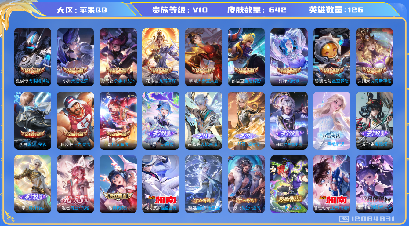 - [12264291]V9 1典藏 1无双 2珍品传说 22传说 126英雄 366皮肤 典藏英雄武则天 可修改实名 优质装备:鸣剑·曳影,雪境奇遇-甄姬,器灵·落星盏,冠军飞将,炽阳神光,一念神魔,末日机甲-孙尚香(绿蚂蚱),地狱火,零号·赤焰,海洋之心,地狱之眼,胖达荣荣,李逍遥,超时空战士-狄仁杰,碎云,山海·苍雷引(电光曜子),浮生妄 珍品传说:时之奇旅-孙策 传说皮:幻光神枪 珍宝阁皮:万物之道,蔷薇恋人,女武神 限定皮:愿照·千秋盛(女娲年限),鸣野蒿,至尊宝,白虎志(电光耗子),凤求凰(白切鸡),太华(伽罗年限),武陵仙君(小桃花),傲雪梅枪,神威(电光马子),飞衡(韩信年限),玄嵩(庄周年限),遇见飞天,高山流水,五谷丰年,青龙志(铠年限),冰锋战神,幽恒(沐浴露),梁祝,御风骁将(吕布年限),岱宗(典韦年限),逐梦之音,李小龙,逐梦之影,玄武志(苏烈年限),朱雀志(守约年限),如梦令-后羿,霸王别姬-项羽,霸王别姬-虞姬,默契交锋-花木兰,孙行者,猪悟能,大圣娶亲,引擎之心,冰霜恋舞曲 史诗皮:器灵·浮梦炉,瑰影绮梦,化蝶舞,龙之律动,灵蛊蚀心,星界战将,茶境仙,百相守梦-黄忠,百相守梦-百里守约,紫霞仙子,电玩小子(小书包),白龙吟,黄金分割率,特工魅影,千年之狐,冰冠公主,江河有灵,百解令(蒙犽),蒙恬荣光圣徽,魅语,无限星赏官,晚萤,偶像歌手,龙骑士(小龙虾),暗夜猫娘,猫狗日记-孙策,猫狗日记-大乔,乱世虎臣,节奏热浪,修罗,女仆咖啡,摇滚巨星,水果甜心,绅士熊喵,天才门将,星夜王子,心灵骇客,时之奇旅-安琪拉,功夫厨神,德古拉伯爵,暗隐猎兽者,幽灵船长,鬼剑武藏,心灵战警,乐园奇幻夜,舞动绿茵,地狱岩魂,纤云弄巧,繁星吟游(呼啦呼啦),拒霜思,缤纷独角兽,乘风破浪,逐浪之夏,月团寄思,水晶猎龙者,箭羽风息,金属风暴,原初追逐者,圣诞狂欢,圣诞恋歌,鹰眼统帅,暗夜贵公子,魅力维加斯,黎明之约,赏金猎手,未来纪元-赵云
