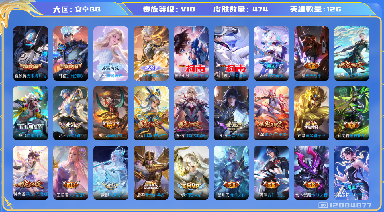 [12084877]V10 2典藏 2无双 2珍品传说 64传说 126英雄 474皮肤 典藏英雄武则天 可修改实名 优质装备:无限飓风号(高达),弑枪猎影(韩信典藏),雪境奇遇,雪境奇遇-甄姬,器灵·螭龙剑,江户川柯南,怪盗基德,黄金狮子座,黄金射手座,绛天战甲(鸡嘴战神),黄金白羊座,猫影幻舞,炽阳神光,一念神魔,云霓雀翎,末日机甲-孙尚香(绿蚂蚱),地狱火,零号·赤焰,海洋之心,地狱之眼,飞鸢探春,音你心动-周瑜,胖达荣荣,乞巧织情,游龙清影(小青龙),淬星耀世,超时空战士-狄仁杰,碎云,山海·炽霜斩(李信年限),山海·琳琅生(小乔年限),山海·苍雷引(电光曜子),浮生妄,百相守梦(张飞),大乔-时之奇旅,夜礼服假面,霜月吟,澜逐花归海,艾琳觅芳踪,云中君群星魔术团,玄雷天君 传说皮:乘龙·问璇玑(孙尚香年限),乘龙·铭钟鼎(赵云年限),乘龙·淬吴钩(孙策年限),典韦战鼓燎原,落雪白狼,星之鸣奏,祥瑞亨通,幻光神枪 珍宝阁皮:妄想食味,优雅恋人,蔷薇恋人 限定皮:愿照·九州拓(澜年限),愿照·福禄聚(蔡文姬年限),愿照·岁时盈(虞姬年限),愿照·山河定(司空震年限),愿照·众生和(妲己年限),愿照·千秋盛(女娲年限),映山客,鸣野蒿,至尊宝,凤求凰(白切鸡),太华(伽罗年限),异界灵契(白毛香),补天,寅虎·展翼(孙膑年限),绯月行,时之彼端,魔法小厨娘,白晶晶,时雨天司(水龙头),神威(电光马子),飞衡(韩信年限),玄嵩(庄周年限),山海·碧波行(瑶年限),瑞麟志(木兰年限),至美·化雀舞,影龙天霄,遇见飞天,高山流水,五谷丰年,冰锋战神,武圣,天狼运算者,游园惊梦,烈魂,虎魄,天狼征服者,天狼绘梦者,李小龙,逐梦之光,辉光之辰,如梦令-后羿,孙行者,猪悟能,天魔缭乱,冰霜恋舞曲,热情桑巴,女儿国国王,寅虎·御盾(廉颇年限),寅虎·瑞焰(虎皮蛋子),寅虎·心曲(虎婆),寅虎·赤拳(老虎年限),时之祈愿-云中君,时之祈愿-瑶(瑶传限),玉兔公主,唐三藏,枫霜尽,匿光启智者,梦圆繁星,山海·玄木吟(马可年限) 史诗皮:鸭鸭历险记-刘禅,苍鳞隐世,器灵·浮梦炉,狼魂孤将,星界战将,龙之律动,石田雨龙,百相守梦-周瑜,茶境仙,海诺心动手记,芈月浮光幕影,决胜骁骑,上官婉儿群星魔术团,蔬乡物语(鲁班七号),乘龙·聚宝船(安琪拉年限),乘龙·忆丹青(大乔年限),琥珀纪元伽罗,百相守