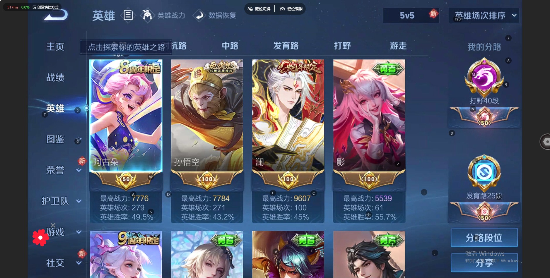 [12085034]实名: 可修改 贵族等级: V10 英雄数: 125 皮肤数: 466 荣耀水晶: 鸣剑·曳影,全息碎影,九霄神辉 无双皮: 碎月剑心,韩信群星魔术团 珍品传说: 兔狲·蓬尾,酷洛米之心,大耳狗之梦,朽木白哉,黑崎一护 传说皮: 黄金狮子座,黄金射手座,绛天战甲,末日机甲-孙尚香,地狱火,仲夏夜之梦,零号·赤焰,时之恋人-刘备,淬星耀世,遇见胡旋,末日机甲-孙策,挚爱之约,挚爱花嫁,无双飞将,碎云,画中仙,妄想实况,艾琳觅芳踪,乘龙·问璇玑,落雪白狼,幻光神枪,祥瑞亨通,星之鸣奏,续相思,诡秘之主 限定皮: 冰锋战神,遇见飞天,李小龙,祈雪灵祝,游园惊梦,梁祝,时雨天司,引擎之心,魔法小厨娘,辉光之辰,异界灵契,天魔缭乱,神威,飞衡,天狼狩猎者,冰霜恋舞曲,逐梦之影,逐梦之光,神奇女侠,美猴王,白虎志,梅西,至尊宝,一生所爱,武陵仙君,如梦令-后羿,大圣娶亲,默契交锋-花木兰,霸王别姬-虞姬,高山流水,孙行者,猪悟能,寅虎·展翼,补天,百木心枪,玉兔公主,启示之音,匿光决锋者,无尽星芒,五谷丰年,神器·万象笔,山海·碧波行,齐天大圣,至美·化雀舞,至美·乘鲤谣,鸣野蒿,陌上桑,愿照·千秋盛,愿照·众生和,愿照·山河定,愿照·岁时盈,愿照·福禄聚,愿照·九州拓