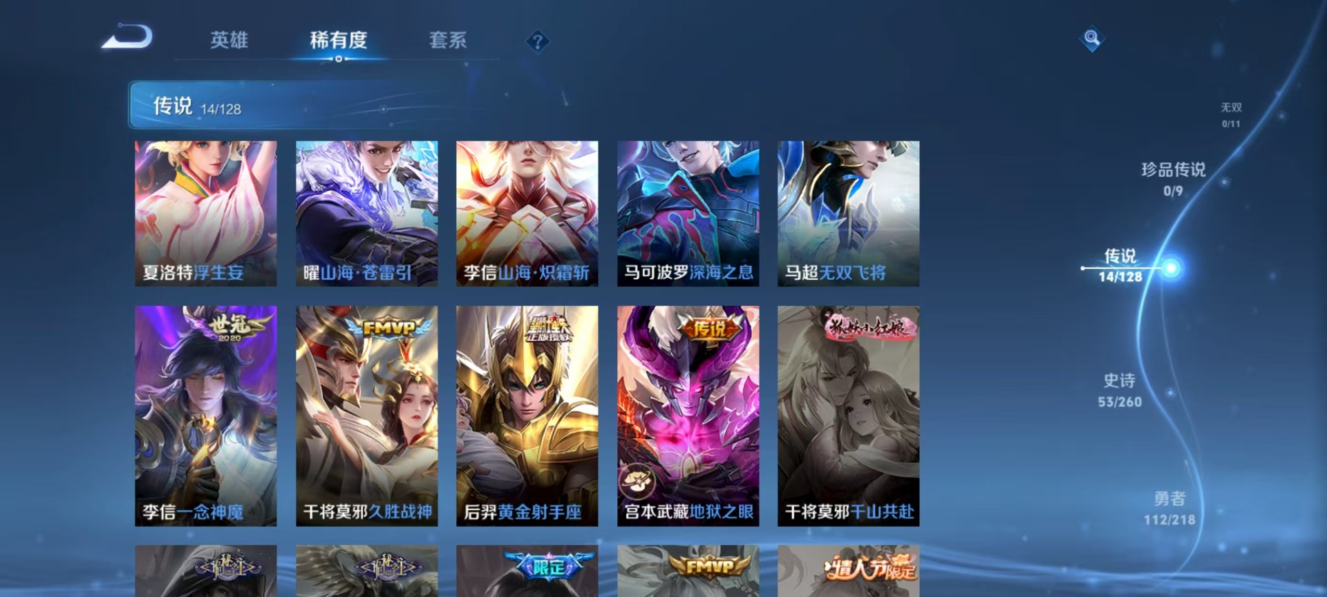 - [11252352]V7 1珍品传说 7传说 125英雄 218皮肤 可修改实名 珍品传说:朽木白哉 传说皮:黄金狮子座,末日机甲-孙尚香(绿蚂蚱),一念神魔,云鹰飞将(小将军) 珍宝阁皮:胡桃夹子,优雅恋人 限定皮:愿照·九州拓(澜年限),鸣野蒿,至尊宝,白晶晶,时雨天司(水龙头),高山流水,冰锋战神,李小龙,朱雀志(守约年限),大圣娶亲 史诗皮:茶境仙,龙之律动,石田雨龙,化蝶舞,紫霞仙子,苍穹之光,黄金分割率,千年之狐,猫狗日记-孙策,节奏热浪,修罗,摇滚巨星,水果甜心,天才门将,星夜王子,心灵骇客,德古拉伯爵,暗隐猎兽者,幽灵船长,鬼剑武藏,心灵战警,纤云弄巧,繁星吟游(呼啦呼啦),缤纷独角兽,乘风破浪,逐浪之夏,水晶猎龙者,曙光守护者,热力回旋,金属风暴,圣诞狂欢,圣诞恋歌,鹰眼统帅,魅力维加斯
