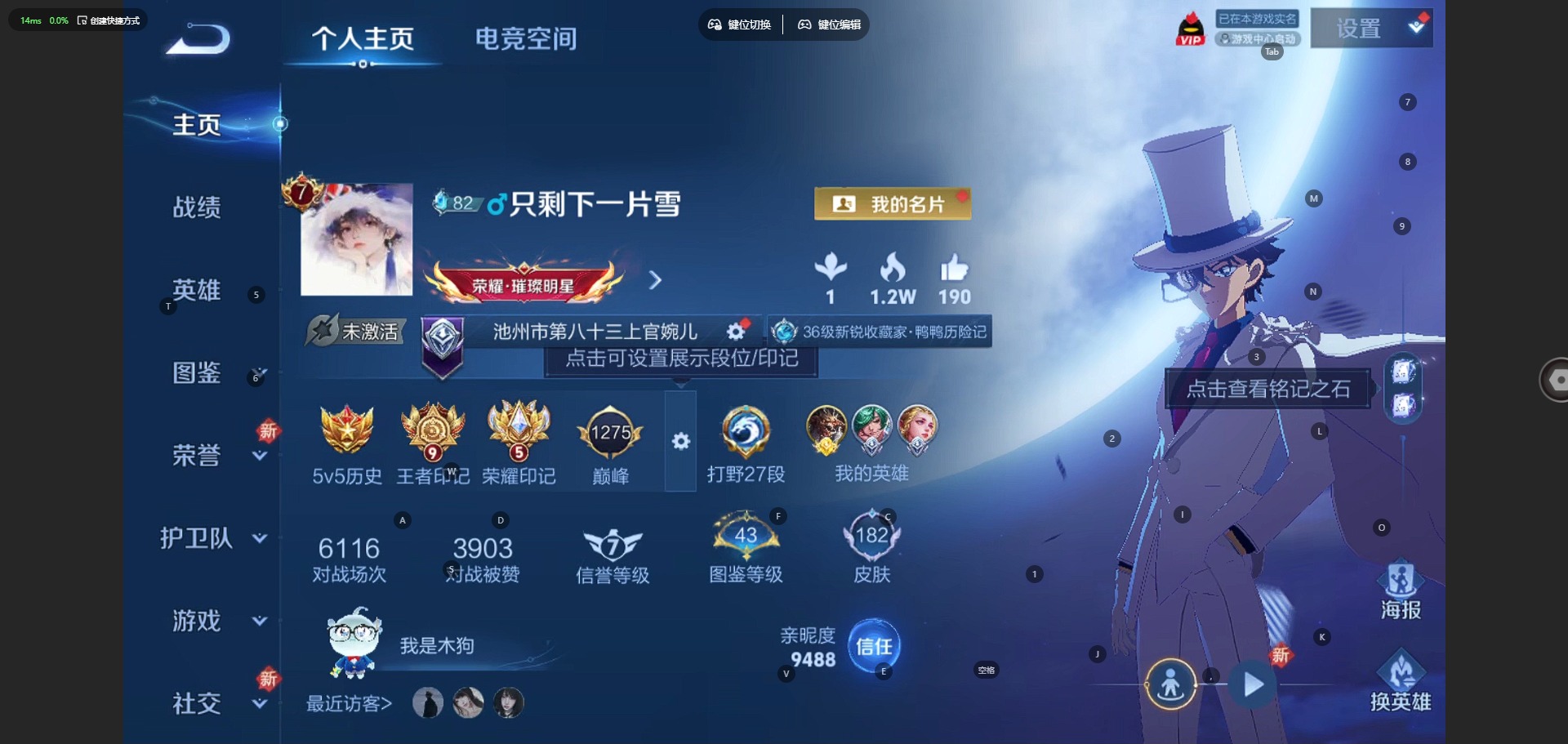 - [11253410]V6 1珍品传说 3传说 124英雄 153皮肤 可修改实名 优质装备:怪盗基德 传说皮:貂蝉曦玄引,幻光神枪 珍宝阁皮:蔷薇恋人 限定皮:鸣野蒿,神威(电光马子),梁祝,默契交锋-花木兰 史诗皮:鸭鸭历险记-刘禅,化蝶舞,星界战将,茶境仙,破空之剑,上官婉儿群星魔术团,百相守梦-百里守约,百相守梦-黄忠,紫霞仙子,特工魅影,千年之狐,永昼,电玩·爆裂旋风,白蛇,冰冠公主,猫狗日记-孙策,乱世虎臣,女仆咖啡,水果甜心,星夜王子,德古拉伯爵,暗隐猎兽者,幽灵船长,鬼剑武藏,心灵战警,逐浪之夏,曙光守护者,鹰眼统帅,暗夜贵公子,魅力维加斯,黎明之约