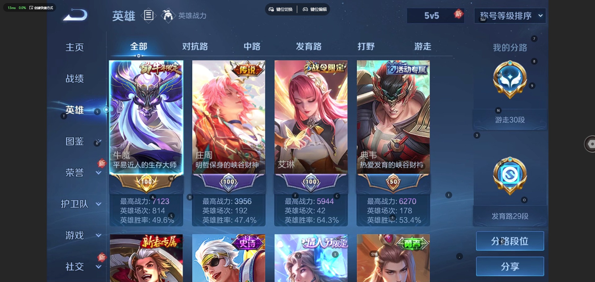 - PX_2089901-贵族等级: V6 英雄数: 124 皮肤数: 149 珍品传说: 怪盗基德 星传说: 星际治安官 传说皮: 云鹰飞将,超时空战士-狄仁杰,典韦战鼓燎原,幻光神枪 限定皮: 高山流水,匿光启智者,五谷丰年,鸣野蒿,愿照·九州拓