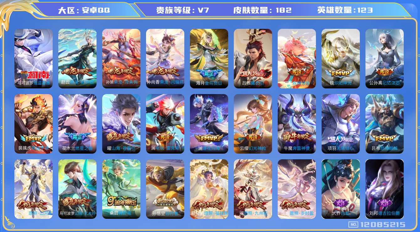 [12085215]V7 1珍品传说 21传说 123英雄 182皮肤 可修改实名 优质装备:怪盗基德,炽阳神光,山海·苍雷引(电光曜子),燃星之曲,记忆之芯(机甲兔),电玩·雷克斯,澜逐花归海,金乌负日,牧神诗旅 传说皮:乘龙·问璇玑(孙尚香年限),乘龙·铭钟鼎(赵云年限),乘龙·淬吴钩(孙策年限),吕布曦玄引,祥瑞亨通,幻光神枪 珍宝阁皮:妄想食味 限定皮:愿照·九州拓(澜年限),愿照·福禄聚(蔡文姬年限),愿照·岁时盈(虞姬年限),愿照·山河定(司空震年限),鸣野蒿,无限倾心-项羽,怒海麟威,奔雷神使(牛魔年限),孙行者,山海·玄木吟(马可年限) 史诗皮:鸭鸭历险记-刘禅,器灵·浮梦炉,化蝶舞,星界战将,龙之律动,怒海争锋,琥珀纪元伽罗,紫霞仙子,永昼,江河有灵,蒙恬荣光圣徽,匿光破解者,偶像歌手,白蛇,百相守梦(刘备),猫狗日记-孙策,节奏热浪,水果甜心,星夜王子,德古拉伯爵,幽灵船长,鬼剑武藏,地狱岩魂,乘风破浪,逐浪之夏,曙光守护者,箭羽风息,金属风暴,圣诞恋歌,鹰眼统帅,魅力维加斯,未来纪元-赵云,玫瑰异探