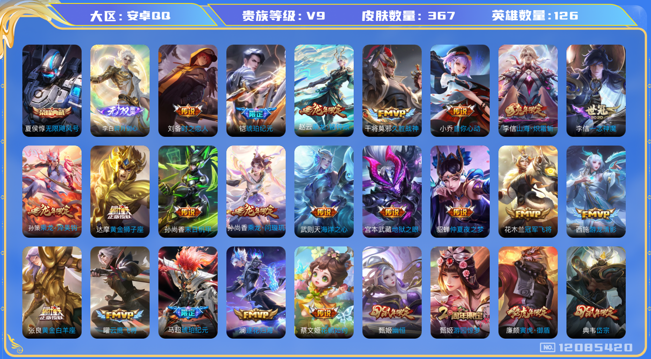 [12085420]V9 1典藏 1无双 25传说 126英雄 367皮肤 典藏英雄武则天 可修改实名 荣耀水晶:无限飓风号(高达) 无双皮:碎月剑心(李白无双) 传说皮:琥珀纪元铠,琥珀纪元马超,乘龙·问璇玑(孙尚香年限),乘龙·铭钟鼎(赵云年限),乘龙·淬吴钩(孙策年限),游龙清影(小青龙),山海·炽霜斩(李信年限),黄金狮子座,黄金白羊座,仲夏夜之梦(大飞蛾),海洋之心,地狱之眼,末日机甲-孙尚香(绿蚂蚱),一念神魔,冠军飞将,久胜战神,云鹰飞将(小将军),音你心动-小乔,时之恋人-刘备(电焊工),花朝如约(花篮子),澜逐花归海 珍宝阁皮:妄想食味,女武神 限定皮:至尊宝,傲雪梅枪,遇见飞天,高山流水,齐天大圣,怒海麟威,降魔,五谷丰年,幽恒(沐浴露),游园惊梦,梁祝,岱宗(典韦年限),李小龙,朱雀志(守约年限),如梦令-后羿,孙行者,猪悟能,引擎之心,寅虎·御盾(廉颇年限),寅虎·瑞焰(虎皮蛋子),时之祈愿-云中君,山海·玄木吟(马可年限) 史诗皮:灵蛊蚀心,龙之律动,琥珀纪元伽罗,化蝶舞,紫霞仙子,苍穹之光,电玩小子(小书包),黄金分割率,特工魅影,千年之狐,永昼,匿光侦查者,江河有灵,高渐离燃音魔法,百解令(蒙犽),蒙恬荣光圣徽,冰冠公主,青蛇,偶像歌手,晚萤,无限星赏官,魅语,白蛇,百相守梦(刘备),暗夜猫娘,龙骑士(小龙虾),末日机甲-吕布,猫狗日记-孙策,猫狗日记-大乔,时之恋人-孙尚香,乱世虎臣,节奏热浪,修罗,女仆咖啡,摇滚巨星,水果甜心,绅士熊喵,天才门将,星夜王子,心灵骇客,时之奇旅-安琪拉,功夫厨神,德古拉伯爵,暗隐猎兽者,幽灵船长,鬼剑武藏,暗渊魔法,心灵战警,乐园奇幻夜,天秀·启明,舞动绿茵,地狱岩魂,诗语江南,纤云弄巧,拒霜思,缤纷独角兽,乘风破浪,逐浪之夏,龙鼓争鸣,月团寄思,水晶猎龙者,曙光守护者,热力回旋,箭羽风息,唤灵魅影,金属风暴,原初追逐者,圣诞狂欢,圣诞恋歌,鹰眼统帅,暗夜贵公子,魅力维加斯,黎明之约,雪上飞焰,奇遇舞章,天秀·音浪,寅虎·御盾,无心,未来纪元-赵云