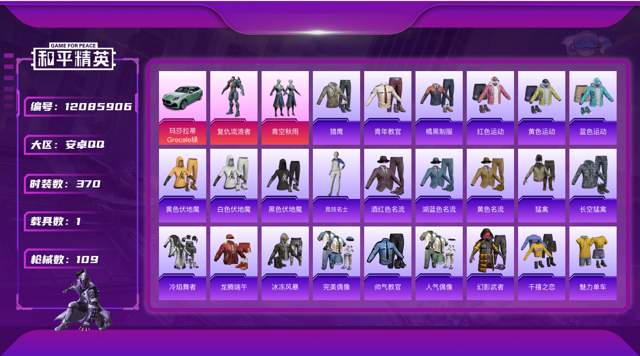 - [12368077]【商品标题】:安卓 手Q-10粉装-5特效枪-9载具-7粉色飞行器-71906热力值-1王牌印记-125套装-153枪皮 【热门品类】:粉装-梦幻火箭,套装-浪客战士,小恶魔头饰 【粉色载具】:特斯拉Model 3(冷光银),阿斯顿马丁DBS(红),玛莎拉蒂Ghibli(粉),合金龙骨(红),海龙奔腾,萌喵橘座,双人摩托-双刃魅影(绿),鬼马风驰,护世瑞兽 【粉色套装】:粉装-梦幻火箭,粉装-金风玉露,粉装-金属狂野,粉装-智能音符,粉装-新星烈龙,粉装-极致幻想,粉装-锦绣火鲤,粉装-绚金战神,粉装-暗翼战神,粉装-酣梦娃娃 【粉色枪皮等级】:AKM-炫紫旋律(四级),M416-心之恋语(七级),M762-甜蜜誓约(七级),P90-沙丘之主(三级),DP-28-扶摇飞仙(四级) 【粉色枪皮】:AKM-炫紫旋律,M416-心之恋语,M762-甜蜜誓约,P90-沙丘之主,DP-28-扶摇飞仙 【粉色飞行器】:梦幻火箭飞行器,伏魔团飞行器,心之恋语飞行翼,锦绣火鲤飞行器,沙丘之主天马,镜域双华-灵镜之阶,龙翔九天飞行器 【粉色降落伞】:甜心宝贝降落伞,春暖花开降落伞,金风玉露降落伞,伏魔团降落伞,繁花小夜曲降落伞,甜蜜誓约降落伞,四圣焕新降落伞,扶摇飞仙降落伞,马卡龙降落伞,锦绣火鲤降落伞,荧光虫舞降落伞,阿狸红降落伞,银刃赛罗降落伞,怪笑疯兔降落伞,暗夜玫瑰降落伞,齐天大圣降落伞,焦糖拿铁降落伞,沙丘之主降落伞,镜域双华降落伞,墨龙九天降落伞 【稀有套装】:套装-极速光影,套装-云朵鹅,套装-雪绒豹 【稀有枪皮】:AKM-四圣焕新,AKM-彩虹符号,AKM-春暖花开,AKM-破晓战魂,AKM-萌趣颜团子,AKM-锦绣火鲤,M16A4-红色方程式,SCAR-L-暗夜玫瑰,SCAR-L-浪客战士,SCAR-L-炫彩节奏,SCAR-L-玉兔迎春,SCAR-L-甜蜜誓约,SCAR-L-生命誓言,SCAR-L-金风玉露,M416-夜灯,M416-神秘黑猫,M416-红色方程式,M416-绯红前夜,M416-蓝色火焰,GROZA-彩虹符号,GROZA-治愈之星,AUG-天降萌叽,AUG-怪笑疯兔,AUG-耀粉歌者,AUG-青春冒险家,AUG-魔法学院,QBZ-原初圣火,QBZ-彩虹符号,QBZ-潮汐统领,QBZ-赛罗,M762-拳皇97,M762-绯红前夜,M762-镭射皇者,