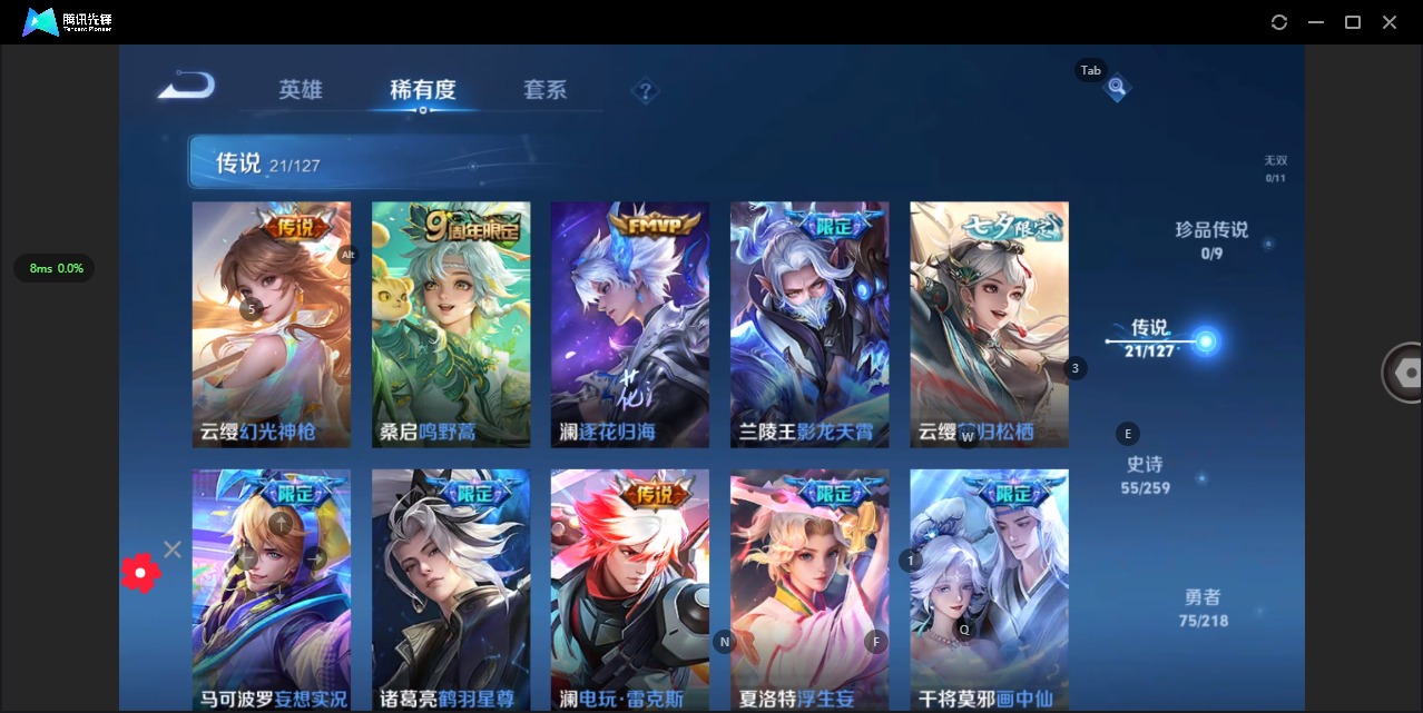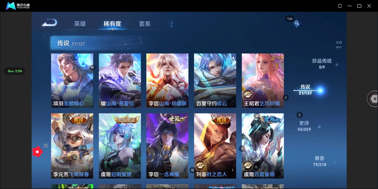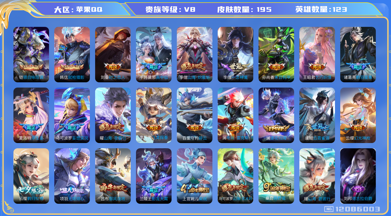[12086003]V8 2典藏 21传说 123英雄 195皮肤 可修改实名 女号 优质装备:银白咏叹调(倪克斯侍卫),弑枪猎影(韩信典藏),一念神魔,云霓雀翎,末日机甲-孙尚香(绿蚂蚱),飞鸢探春,乞巧织情,时之恋人-刘备(电焊工),碎云,山海·炽霜斩(李信年限),山海·苍雷引(电光曜子),画中仙,浮生妄,电玩·雷克斯,鹤羽星尊,妄想实况,鹤归松栖(云缨),澜逐花归海 传说皮:幻光神枪 珍宝阁皮:万物之道 限定皮:鸣野蒿,山海·碧波行(瑶年限),无限倾心-项羽,影龙天霄,梁祝,御风骁将(吕布年限),山海·玄木吟(马可年限) 史诗皮:鸭鸭历险记-刘禅,龙之律动,石田雨龙,东方月初,琥珀纪元伽罗,特工魅影,电玩·兔顽号,匿光破解者,电玩·爆裂旋风,真我赫兹(镜),浮梦罗烟,真我赫兹(百里守约),鹤归松栖(赵怀真),匿光侦查者,江河有灵,百解令(蒙犽),偶像歌手,冰冠公主,末日机甲-吕布,猫狗日记-孙策,乱世虎臣,修罗,女仆咖啡,摇滚巨星,水果甜心,德古拉伯爵,暗隐猎兽者,鬼剑武藏,舞动绿茵,拒霜思,月团寄思,水晶猎龙者,曙光守护者,箭羽风息,金属风暴,圣诞狂欢,圣诞恋歌,鹰眼统帅,暗夜贵公子,赏金猎手,未来纪元-赵云