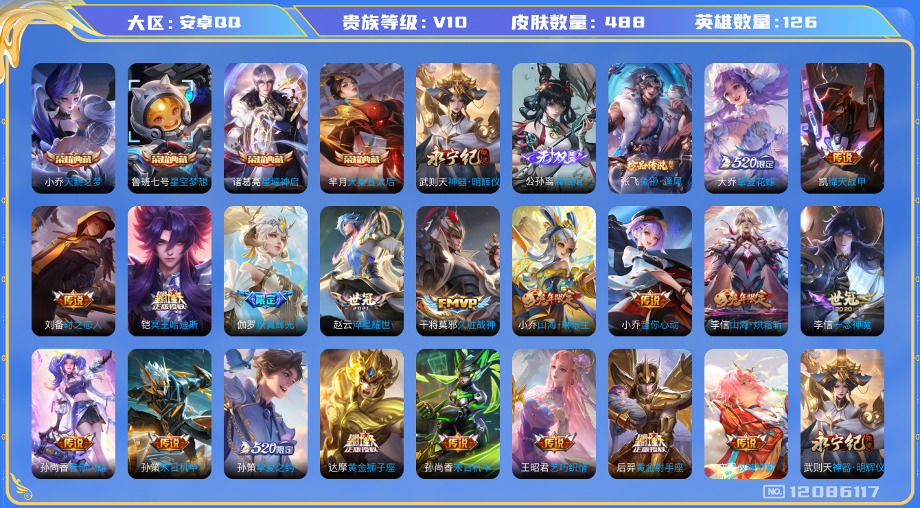 [12086117]V10 4典藏 2无双 1珍品传说 71传说 126英雄 488皮肤 典藏英雄武则天 可修改实名 优质装备:天鹅之梦(小乔典藏),星空梦想(太空人),大秦宣太后,星域神启(倪克斯贼亮),神器·明辉仪,离恨烟(公孙离无双),黄金狮子座,黄金射手座,冠军飞将,云鹰飞将(小将军),绛天战甲(鸡嘴战神),黄金白羊座,猫影幻舞,久胜战神,炽阳神光,一念神魔,云霓雀翎,末日机甲-孙尚香(绿蚂蚱),地狱火,仲夏夜之梦(大飞蛾),音你心动-小乔,零号·赤焰,海洋之心,地狱之眼,飞鸢探春,音你心动-周瑜,胖达荣荣,李逍遥,乞巧织情,时之恋人-刘备(电焊工),游龙清影(小青龙),淬星耀世,超时空战士-狄仁杰,末日机甲-孙策,花朝如约(花篮子),挚爱之约,挚爱花嫁,无双飞将,音你闪耀(rap皮),碎云,天秀幻梦,神器·狴犴令,神器·明辉仪,山海·炽霜斩(李信年限),山海·琳琅生(小乔年限),山海·苍雷引(电光曜子),炽翼辉光(娃娃菜牛角包),燃星之曲,追逃游戏(安琪拉),澜逐花归海,艾琳觅芳踪,云中君群星魔术团,朵莉亚心动手记,牧神诗旅,涂山容容 珍品传说:兔狲·蓬尾 传说皮:铠冥王哈迪斯,幻光神枪 珍宝阁皮:蔷薇恋人,女武神 限定皮:逐霄战戟,映山客,陌上桑,鸣野蒿,凤求凰(白切鸡),凤凰于飞,太华(伽罗年限),武陵仙君(小桃花),异界灵契(白毛香),傲雪梅枪,补天,寅虎·展翼(孙膑年限),前尘镜,星穹之声,绯月行,时之彼端,白鹤梁神女,魔法小厨娘,神威(电光马子),飞衡(韩信年限),玄嵩(庄周年限),山海·碧波行(瑶年限),无限倾心-项羽,瑞麟志(木兰年限),至美·乘鲤谣,遇见飞天,高山流水,诗剑行,无限倾心-虞姬,齐天大圣,匿光决锋者,怒海麟威,降魔,五谷丰年,青龙志(铠年限),冰锋战神,幽恒(沐浴露),武圣,龙胆,烈魂,岱宗(典韦年限),虎魄,天狼绘梦者,李小龙,玄武志(苏烈年限),朱雀志(守约年限),如梦令-嫦娥,霸王别姬-虞姬,奇迹圣诞,纯白花嫁,孙行者,猪悟能,一生所爱,热情桑巴,匿光追影者,女儿国国王,寅虎·御盾(廉颇年限),寅虎·心曲(虎婆),寅虎·赤拳(老虎年限),时之祈愿-云中君,时之祈愿-瑶(瑶传限),百木心枪,玉兔公主,启示之音,无尽星芒,深海之息(深海大菠萝),唐三藏,枫霜尽,匿光启智者,时之奇旅-妲己,神器·万象笔,梦圆繁星,山海·玄木吟(马可年限),冰