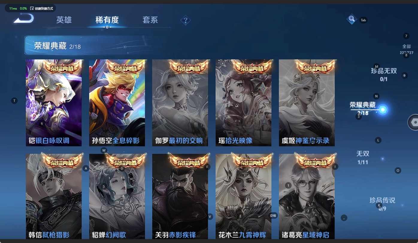 曹操天狼征服者,后羿辉光之辰,裴擒虎李小龙,裴擒虎寅虎·赤拳,上官婉儿梁祝,上官婉儿天狼绘梦者,猪八戒猪悟能,孙悟空大圣娶亲,孙悟空至尊宝,百里玄策白虎志,马超神威,橘右京枫霜尽