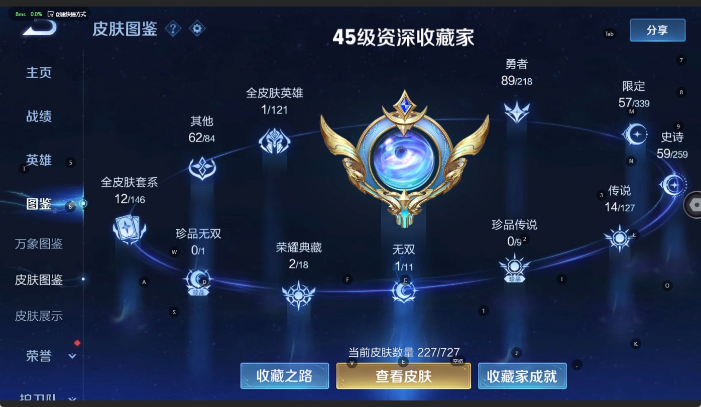 - PX_2093182-54 安卓QQ/至尊星耀/248皮肤/125英雄/2典藏/0珍品无双/0无双/1珍品传说/20传说/63史诗/9稀有英雄 【1 珍品传说】怪盗基德 马可波罗, 【2 典藏皮肤】鸣剑·曳影 李白,弑枪猎影 韩信, 【20 传说皮肤】启明星使 虞姬,逐花归海 澜,云鹰飞将 曜,齐天大圣 孙悟空,诗剑行 李白,浮生妄 夏洛特,记忆之芯 公孙离,地狱之眼 宫本武藏,炽阳神光 镜,霜月