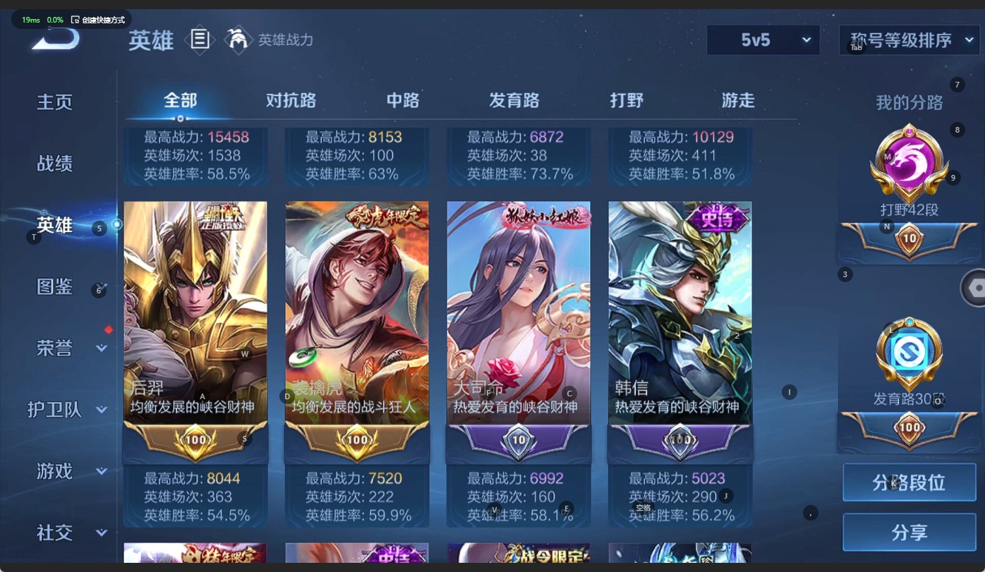 - [11528542]V5 4传说 115英雄 116皮肤 可修改实名 优质装备:黄金狮子座,黄金射手座,时之恋人-刘备(电焊工) 珍宝阁皮:胡桃夹子 限定皮:鸣野蒿,神威(电光马子),飞衡(韩信年限),梁祝,龙胆,烈魂,李小龙 史诗皮:特工魅影,千年之狐,江河有灵,冰冠公主,暗夜猫娘,末日机甲-吕布,修罗,水果甜心,天才门将,德古拉伯爵,暗隐猎兽者,鬼剑武藏,纤云弄巧,水晶猎龙者,圣诞狂欢,鹰眼统帅,未来纪元-赵云