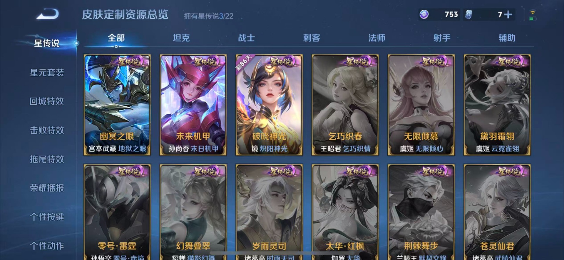 铠冥王哈迪斯,赵云乘龙·铭钟鼎,张飞百相守梦,典韦战鼓燎原,李信一念神魔,孙策乘龙·淬吴钩,达摩黄金狮子座,孙尚香乘龙·问璇玑,王昭君乞巧织情,吕布遇见神鼓,后羿千劫归真,镜炽阳神光,周瑜音你心动,杨玉环星之鸣奏,公孙离记忆之芯,亚连落雪白狼,裴擒虎祥瑞亨通,夏洛特浮生妄,艾琳觅芳踪,西施游龙清影,狄仁杰神器·狴犴令,张良黄金白羊座,马超无双飞将,墨子黄金天蝎座,澜逐花归海,云缨幻光神枪