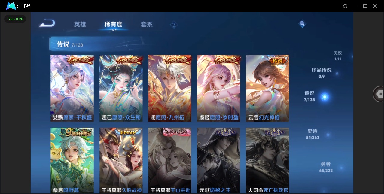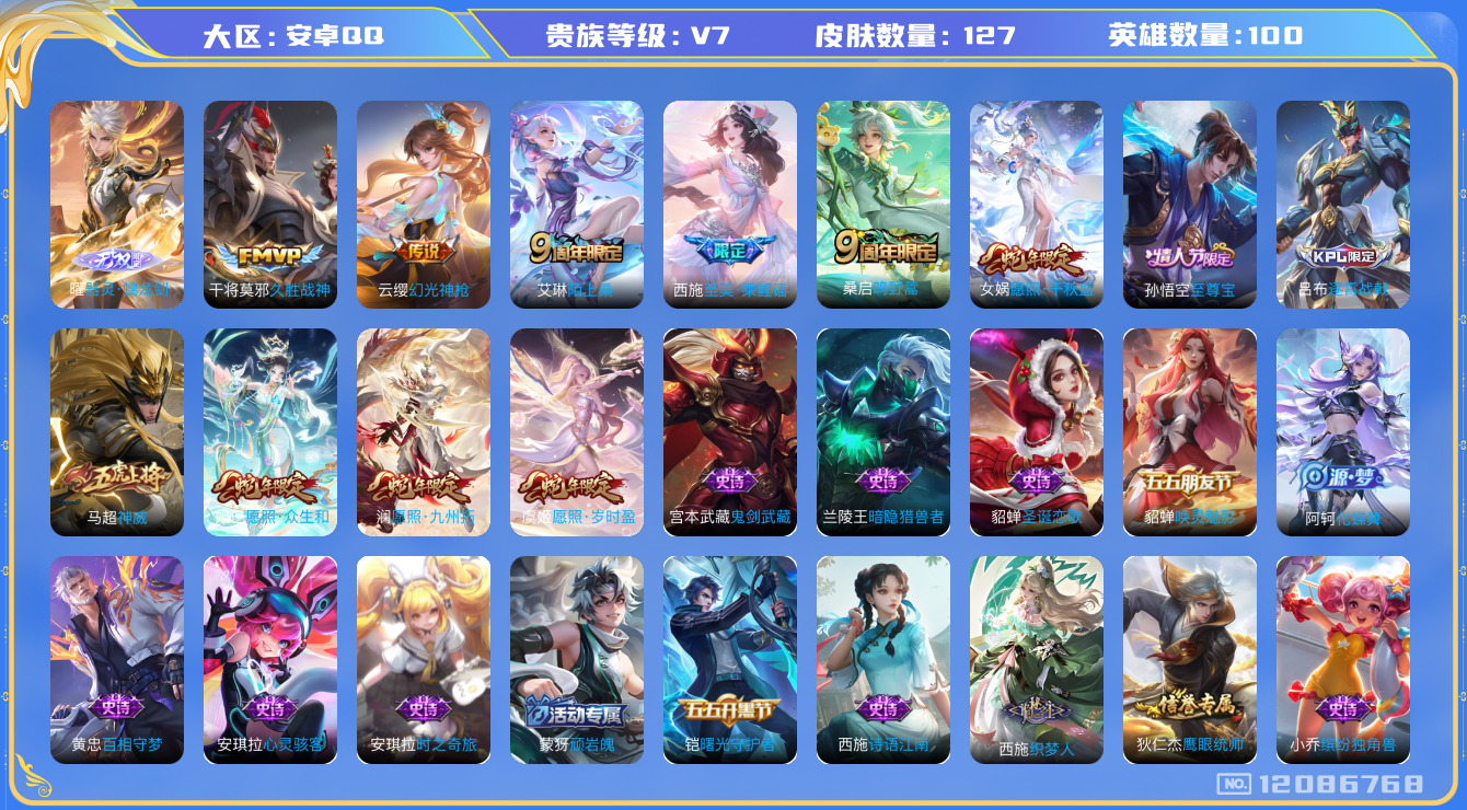 [12086768]V7 1无双 7传说 100英雄 127皮肤 可修改实名 优质装备:器灵·螭龙剑,久胜战神 传说皮:幻光神枪 珍宝阁皮:妄想食味 限定皮:愿照·九州拓(澜年限),愿照·岁时盈(虞姬年限),愿照·众生和(妲己年限),愿照·千秋盛(女娲年限),逐霄战戟,陌上桑,鸣野蒿,至尊宝,神威(电光马子),至美·乘鲤谣 史诗皮:化蝶舞,龙之律动,战舞者,蒙犽顽岩魄,百相守梦-黄忠,织梦人,遇见神鹿,偶像歌手,末日机甲-吕布,时之恋人-孙尚香,女仆咖啡,水果甜心,心灵骇客,时之奇旅-安琪拉,功夫厨神,暗隐猎兽者,鬼剑武藏,诗语江南,缤纷独角兽,逐浪之夏,曙光守护者,唤灵魅影,金属风暴,圣诞恋歌,鹰眼统帅,魅力维加斯