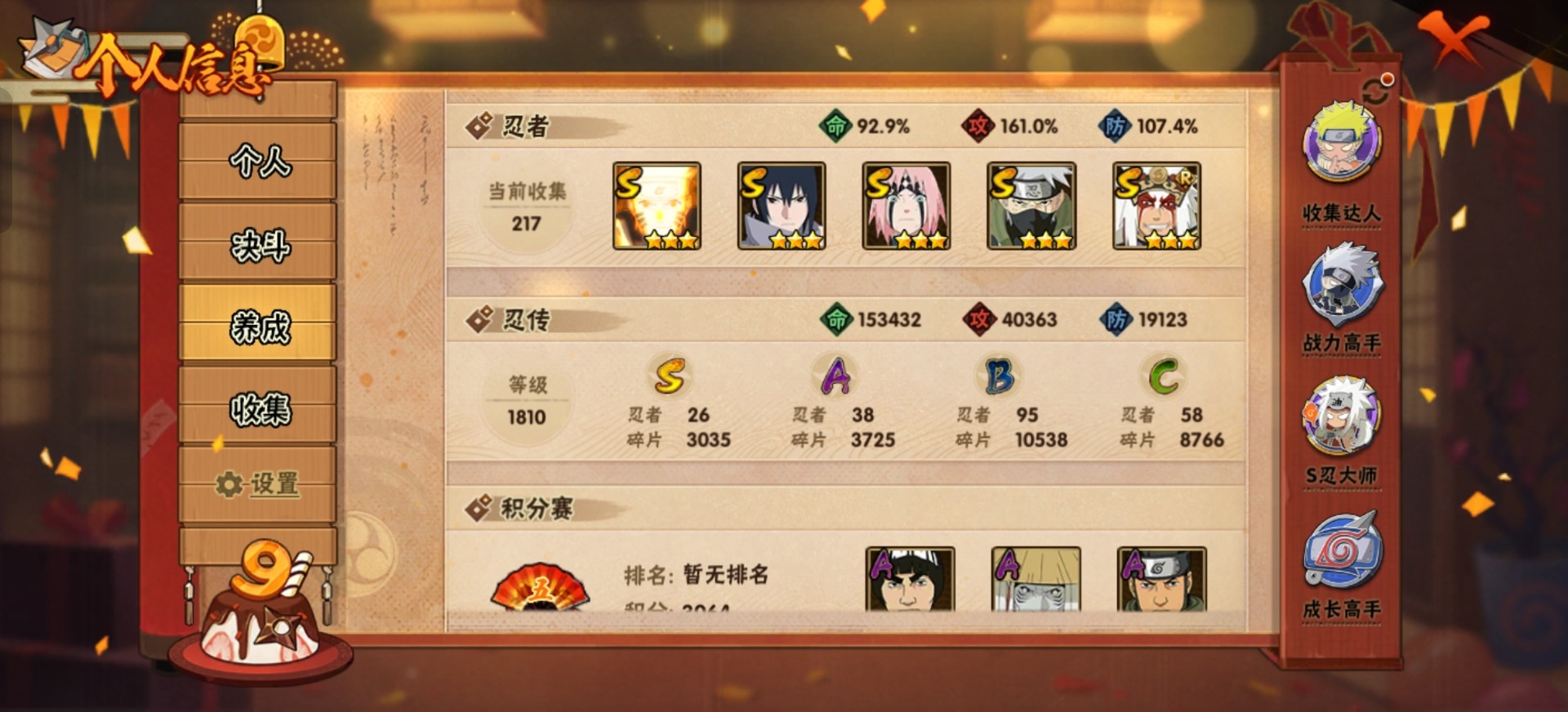 [12086783]V11 26S忍 38A忍 17通灵 1109.4W战力 可二次 可修改实名 优质装备:千手柱间「秽土转生」,宇智波鼬「秽土转生」,药师兜「仙人模式」,宇智波斑「秽土转生」,艾「三代目雷影」,千手柱间,迈特凯「死门」,宇智波带土 「忍界大战」,“宇智波斑” 「白面具」,漩涡鸣人 「九喇嘛连结」,春野樱 「忍界大战」,神秘面具男 「红夜之刃」,宇智波佐助「永恒万花筒」,千手柱间·木叶创立,宇智波斑「秽土转生·解」,大筒木桃式,艾「忍界大战」,宇智波止水「须佐能乎」,旗木卡卡西「须佐能乎」,自来也 「传说中的三忍」 S级忍者:自来也 「舞之豪杰」,宇智波鼬 「须佐能乎」,佩恩「天道」,波风水门,大蛇丸,纲手