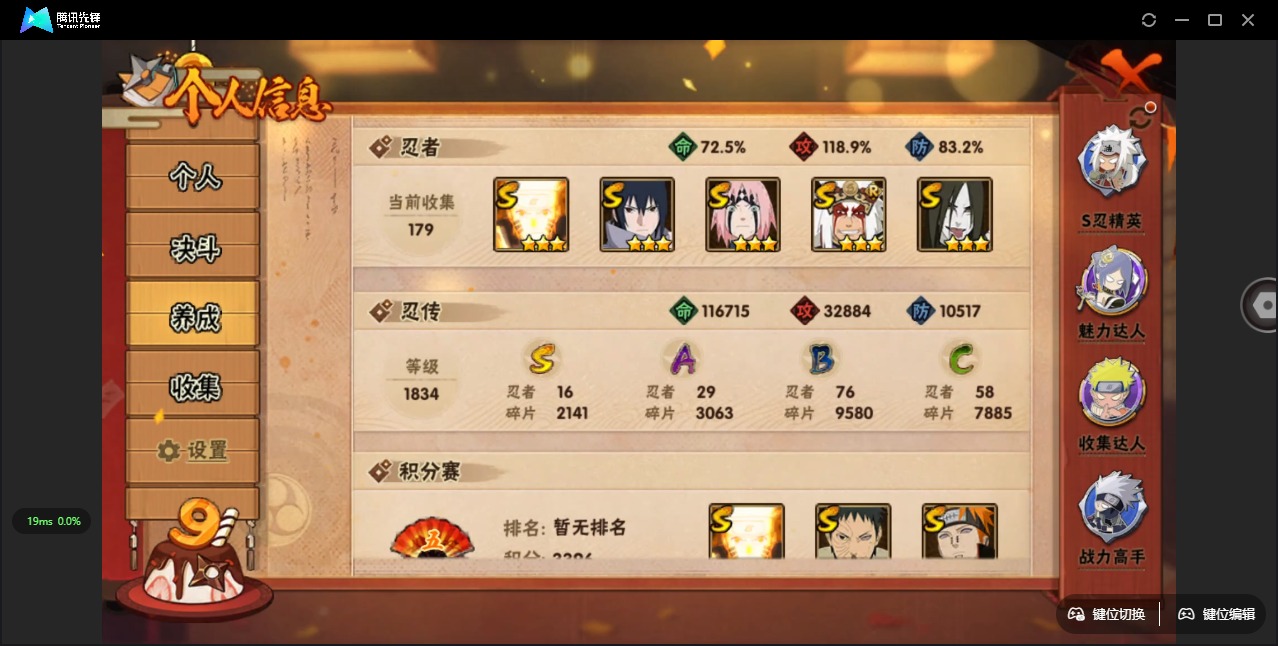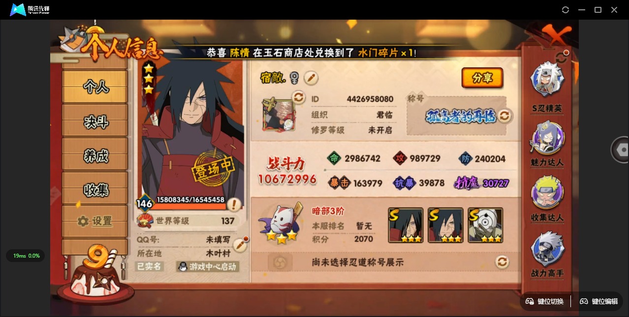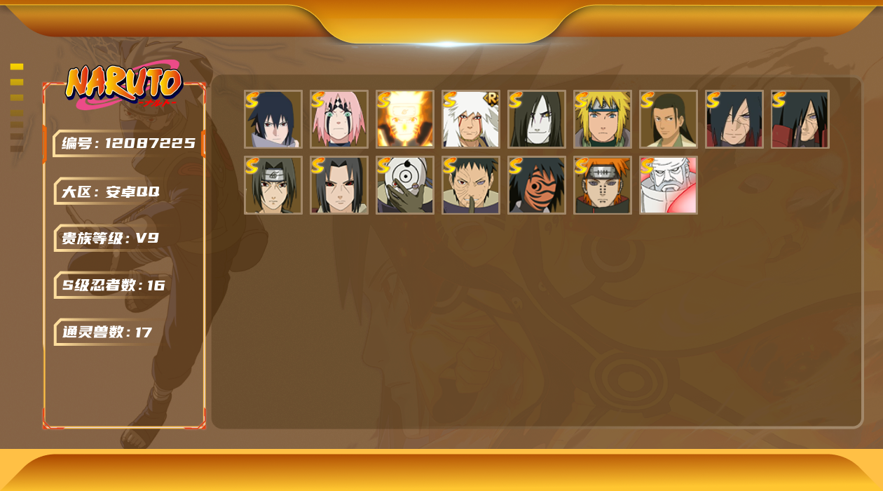 [12087225]V9 16S忍 29A忍 17通灵 1067.2W战力 可二次 可修改实名 优质装备:宇智波鼬「秽土转生」,宇智波斑「秽土转生」,宇智波带土 「忍界大战」,“宇智波斑” 「白面具」,漩涡鸣人 「九喇嘛连结」,大筒木金式「博人传」,春野樱 「忍界大战」,神秘面具男 「红夜之刃」,宇智波佐助「永恒万花筒」,千手柱间·木叶创立,宇智波斑「秽土转生·解」 S级忍者:自来也 「舞之豪杰」,宇智波鼬 「须佐能乎」,佩恩「天道」,波风水门,大蛇丸