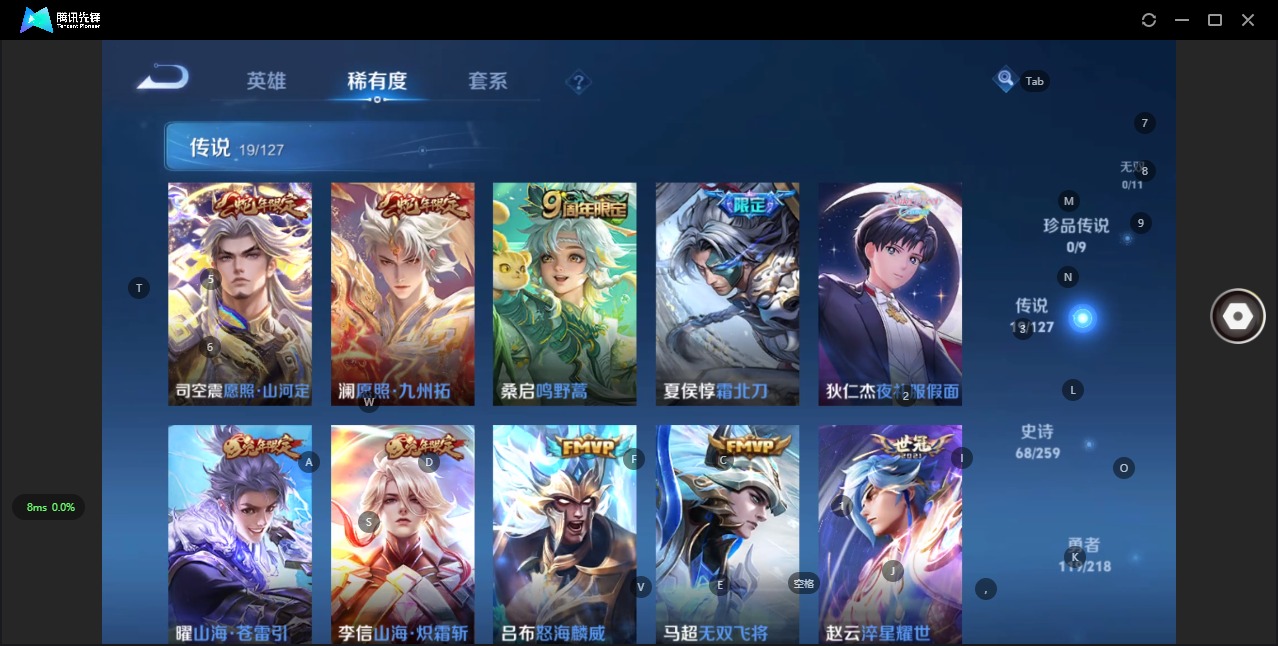 [12087220]V8 1典藏 19传说 124英雄 269皮肤 可修改实名 优质装备:弑枪猎影(韩信典藏),黄金狮子座,黄金射手座,云鹰飞将(小将军),绛天战甲(鸡嘴战神),一念神魔,末日机甲-孙尚香(绿蚂蚱),时之恋人-刘备(电焊工),淬星耀世,超时空战士-狄仁杰,无双飞将,山海·炽霜斩(李信年限),山海·苍雷引(电光曜子),夜礼服假面 珍宝阁皮:胡桃夹子,玩趣恶龙 限定皮:愿照·九州拓(澜年限),愿照·山河定(司空震年限),逐霄战戟,鸣野蒿,夏侯惇霜北刀,怒海麟威,降魔,五谷丰年,烈魂,李小龙,引擎之心,山海·玄木吟(马可年限) 史诗皮:鸭鸭历险记-刘禅,化蝶舞,星界特工,龙之律动,藏狐·褐绒,百相守梦-周瑜,茶境仙,蒙犽顽岩魄,埋骨钱,百相守梦-百里守约,百相守梦-黄忠,紫霞仙子,特工魅影,千年之狐,永昼,江河有灵,蒙恬荣光圣徽,偶像歌手,暗夜猫娘,魅语,无限星赏官,末日机甲-吕布,猫狗日记-大乔,乱世虎臣,修罗,女仆咖啡,摇滚巨星,水果甜心,绅士熊喵,暗隐猎兽者,鬼剑武藏,暗渊魔法,心灵战警,舞动绿茵,纤云弄巧,缤纷独角兽,乘风破浪,逐浪之夏,龙鼓争鸣,水晶猎龙者,曙光守护者,热力回旋,箭羽风息,金属风暴,原初追逐者,圣诞恋歌,鹰眼统帅,魅力维加斯,赏金猎手,无心,未来纪元-赵云
