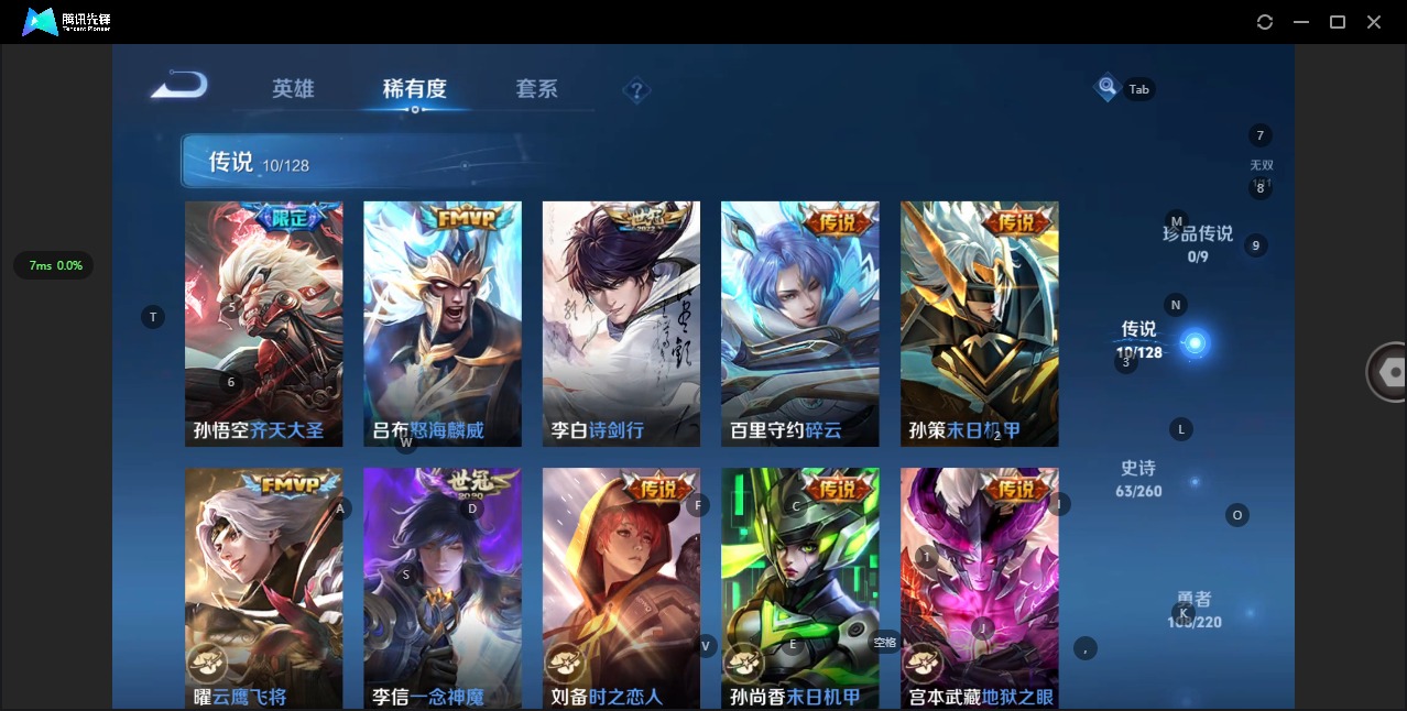 - [12263449]猴子典藏,久胜,紫霞,-可二次-108英雄-165皮肤-1典藏-7传说-31史诗 辉光之辰-后羿 街头霸王-韩信